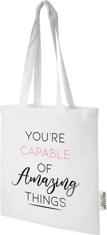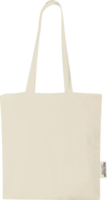 O saco “Madras” 100 % feito de algodão reciclado com certificado GRS é o saco de oferta perfeito para qualquer evento, conferência ou para usar como um saco de compras para pequenos mantimentos. A densidade de algodão de 140 g/m² torna o saco resistente, durável e adequado para transportar itens pesados no compartimento principal. Com as alças de ombro de 30 cm de comprimento, este saco é fácil de transportar. Os métodos de impressão disponíveis para este saco também são certificados pela GRS, garantindo que toda a cadeia de fornecimento seja transparente e certificada. Fabricado na Índia. Resistência até 5kg de peso.