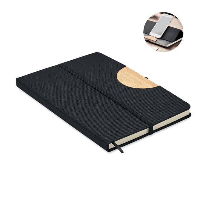 Caderno A5 com capa dura 600D RPET com detalhe em bambu com função de suporte para smartphone. Encadernação em casebound. 160 páginas alinhadas (80 folhas). 70 gsm de papel reciclado. Correia de fecho elástico, marcador de página com fita e suporte para caneta. Leve este escritório essencial consigo para a sua próxima reunião. A ter uma reunião à distância? Abra o suporte do telefone e coloque-o no seu aparelho para que não tenha de ser você a segurá-lo. FSC®-certified | FSC MIX CREDIT, P7.1, FSC-C213206