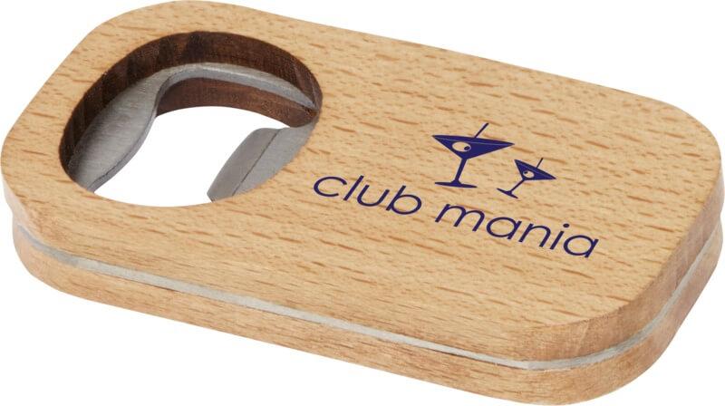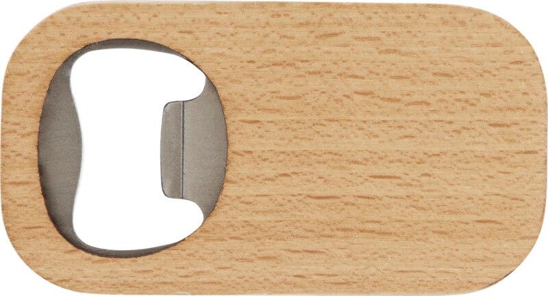 Abre garrafas de aço inoxidável com superfície de madeira.