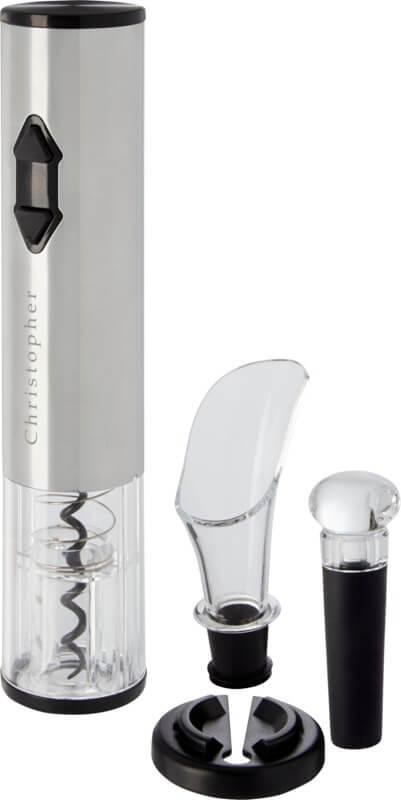 Abre garrafas de vinho eletrico em combinação com um cortador de películas, um vertedor e uma rolha. Funciona com 4 pilhas AA (não incluídas).
