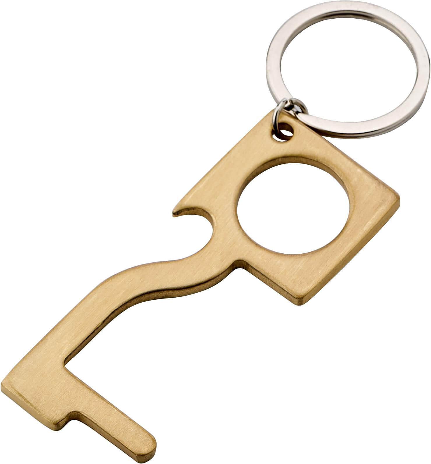 Abre-portas de cobre com abre-cápsulas e porta-chaves. Utilize-o para abrir portas e premir botões para uso público, sem ter de lhes tocar