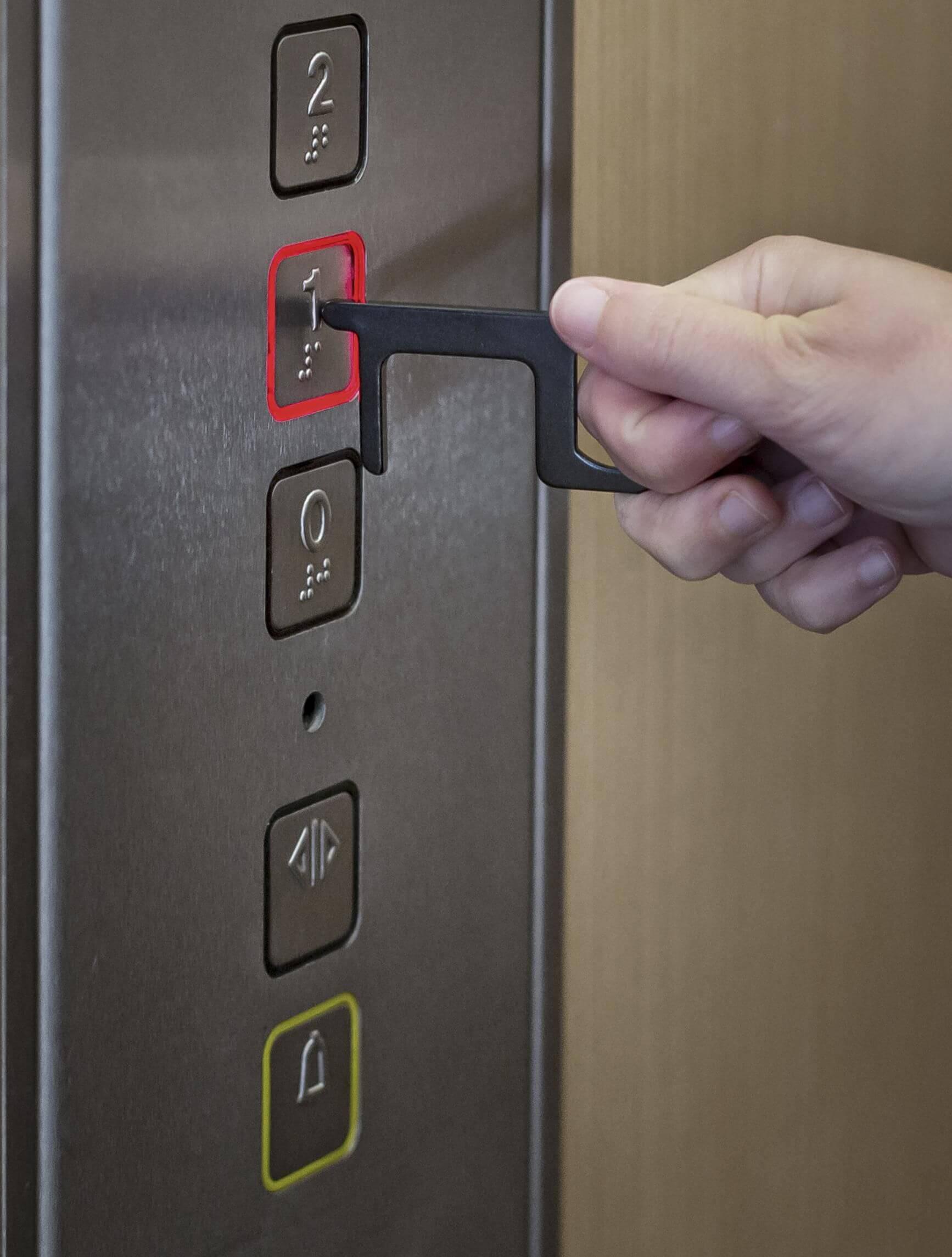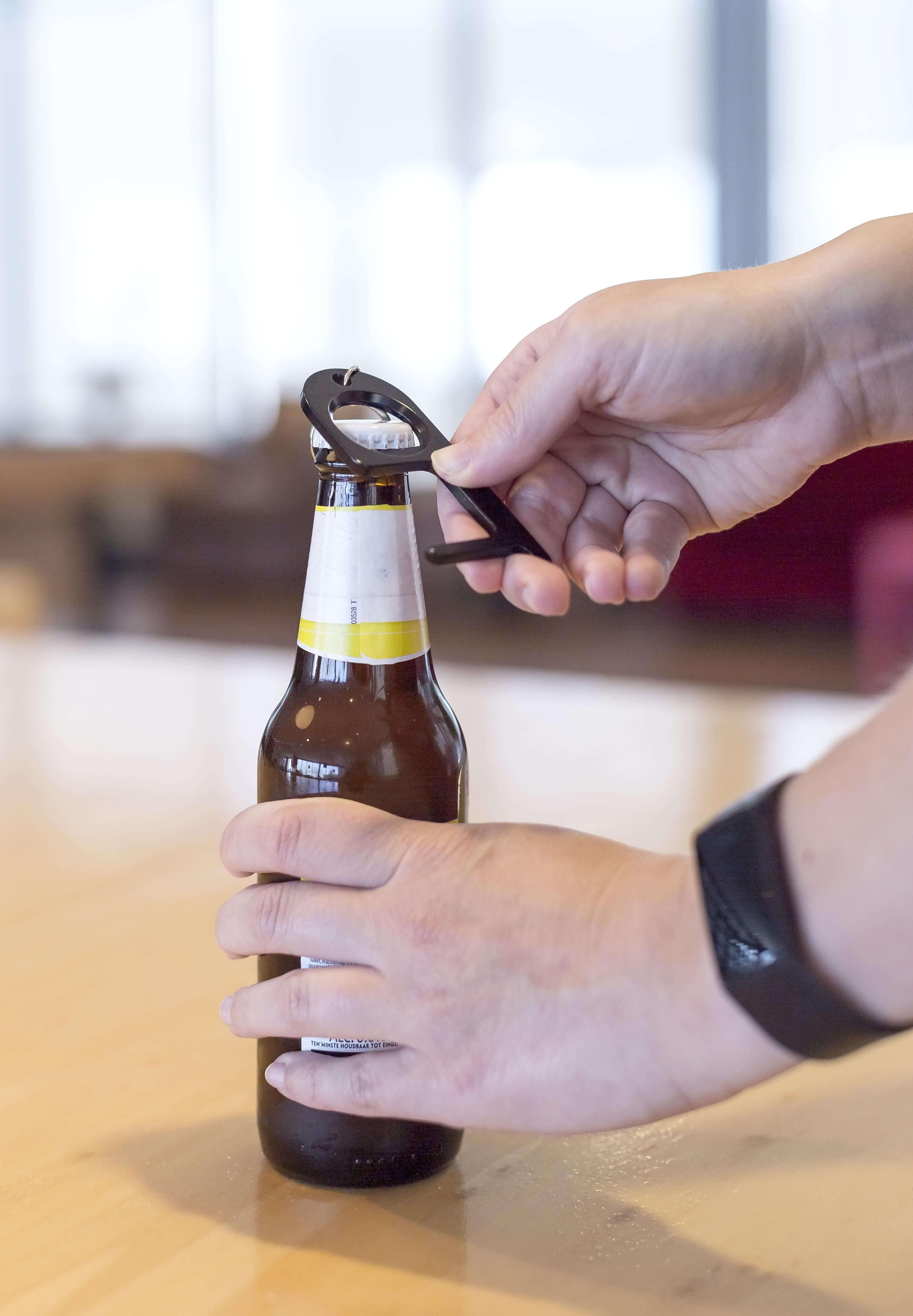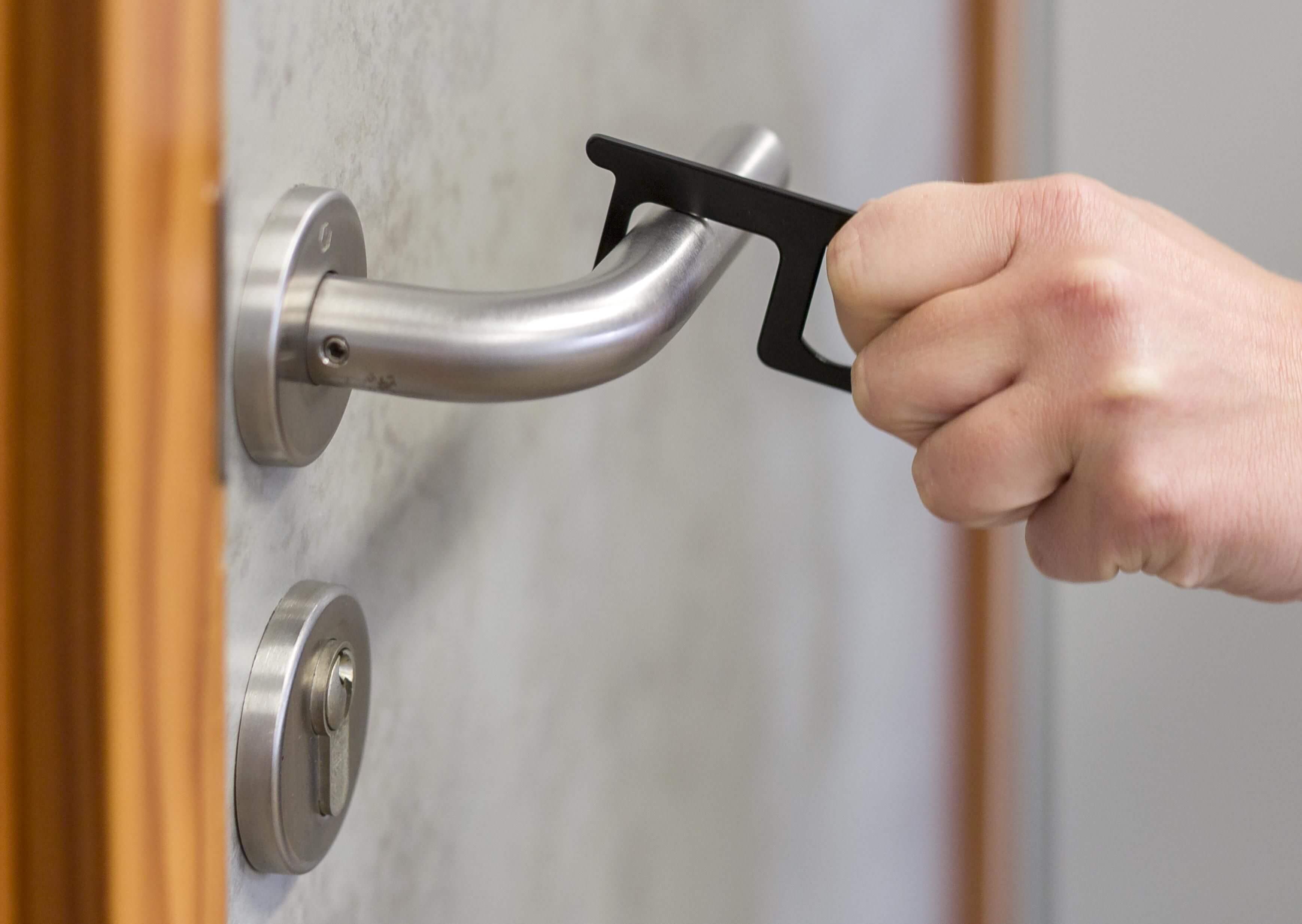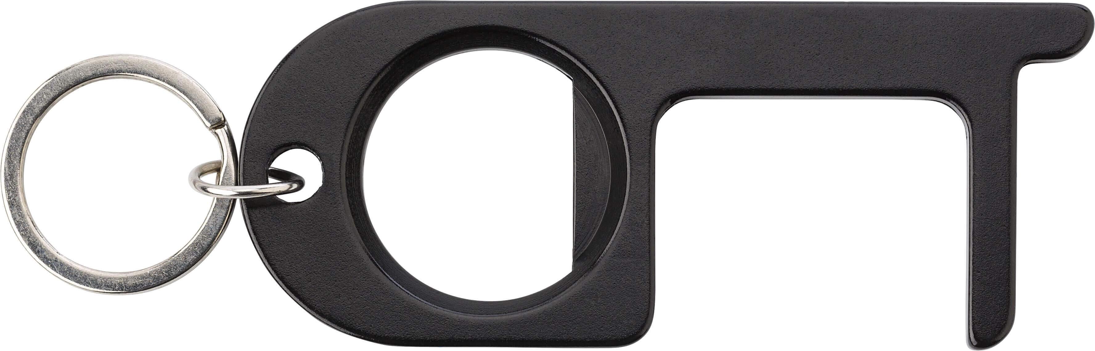 Abre-portas de alumínio com abre-cápsulas e porta-chaves. Utilize-o para abrir portas e premir botões para uso público, sem ter de lhes tocar.