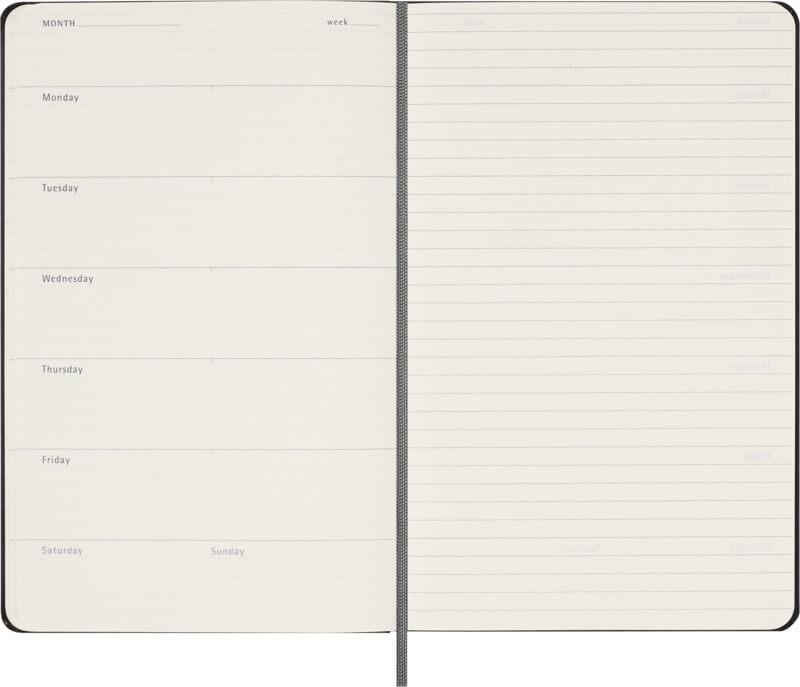 A agenda semanal de capa dura sem datas “Moleskine” pode ser estreada em qualquer altura do ano. É uma excelente escolha para quem procura uma ferramenta de planeamento flexível e durável. Os espaços do mês, da semana e da data são deixados em branco, proporcionando mais flexibilidade e liberdade do que uma agenda datada. Ao preencher as datas à sua maneira, pode ignorar os espaços que quiser e utilizar apenas as páginas de que precisa. Apresenta 12 divisórias mensais personalizáveis, cinco semanas por mês sem datas, um fecho elástico e um marcador de fita a condizer, papel cor de marfim de 70 g/m2 isento de ácido e um bolso interno expansível.