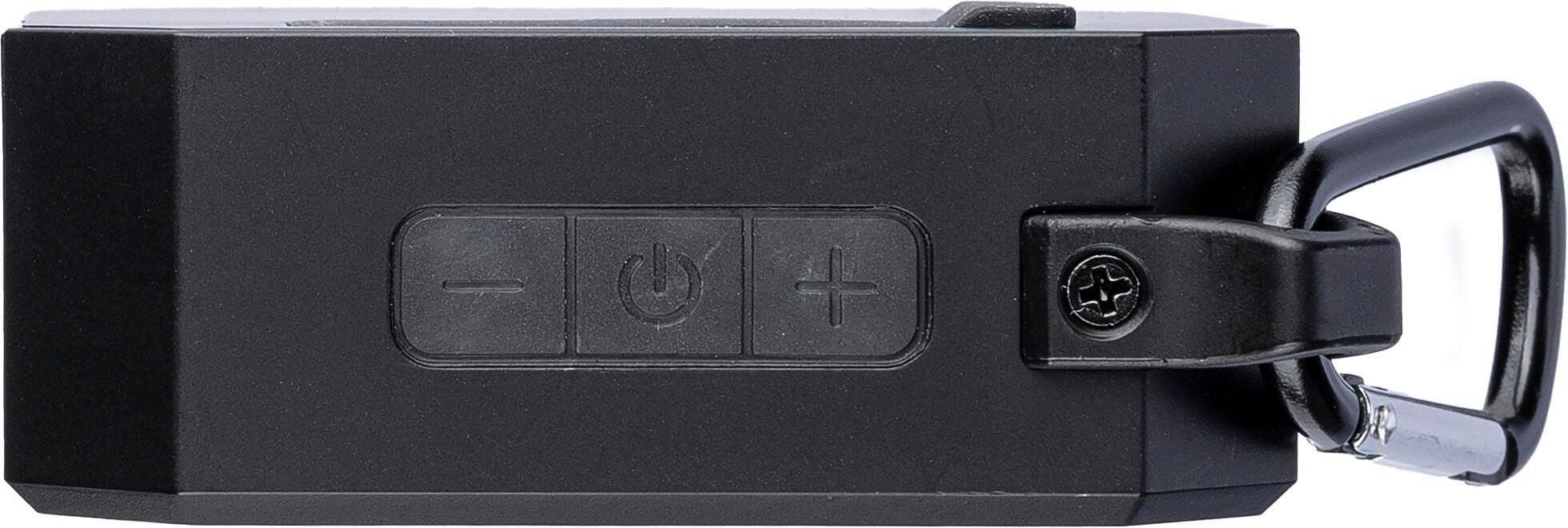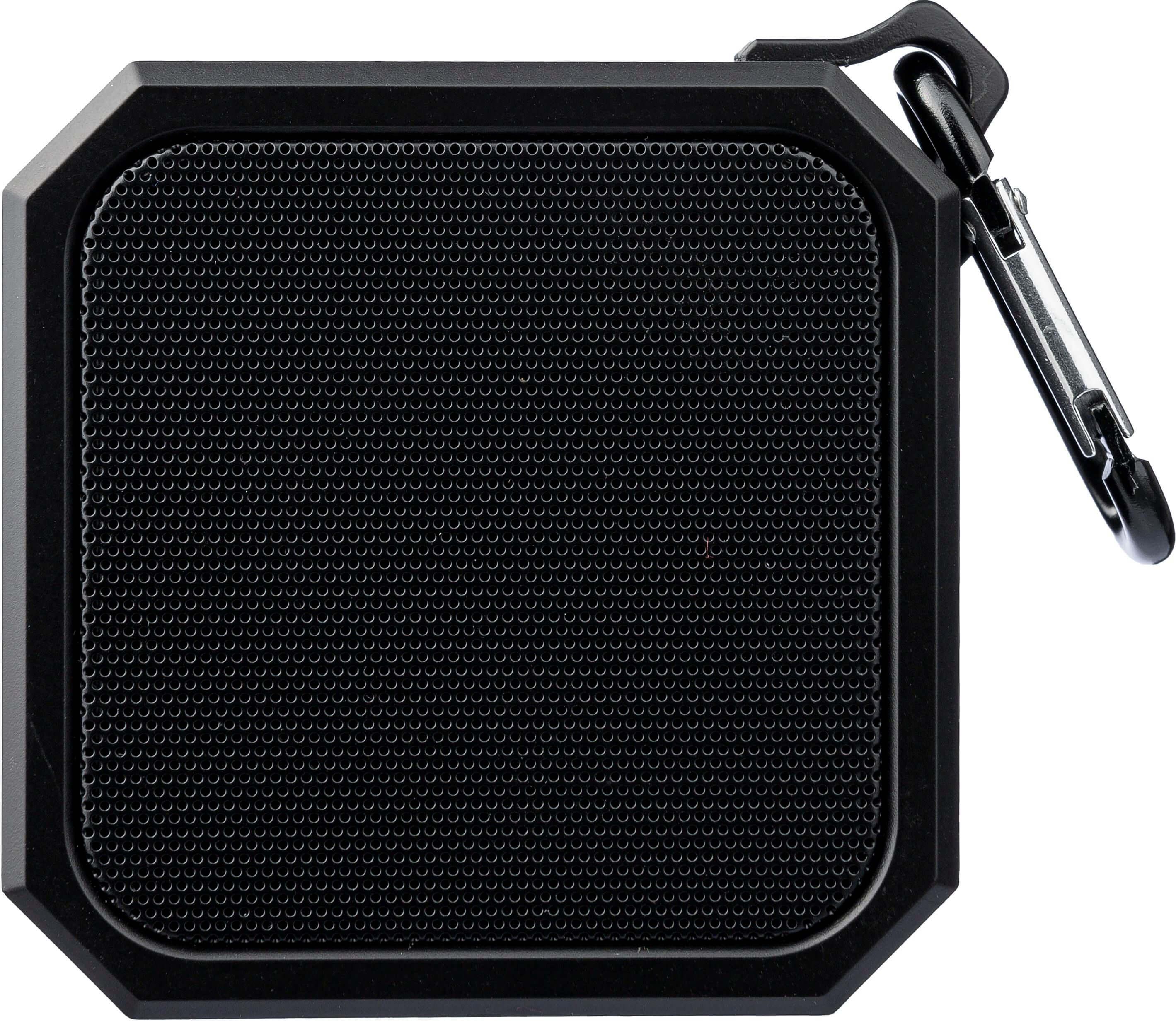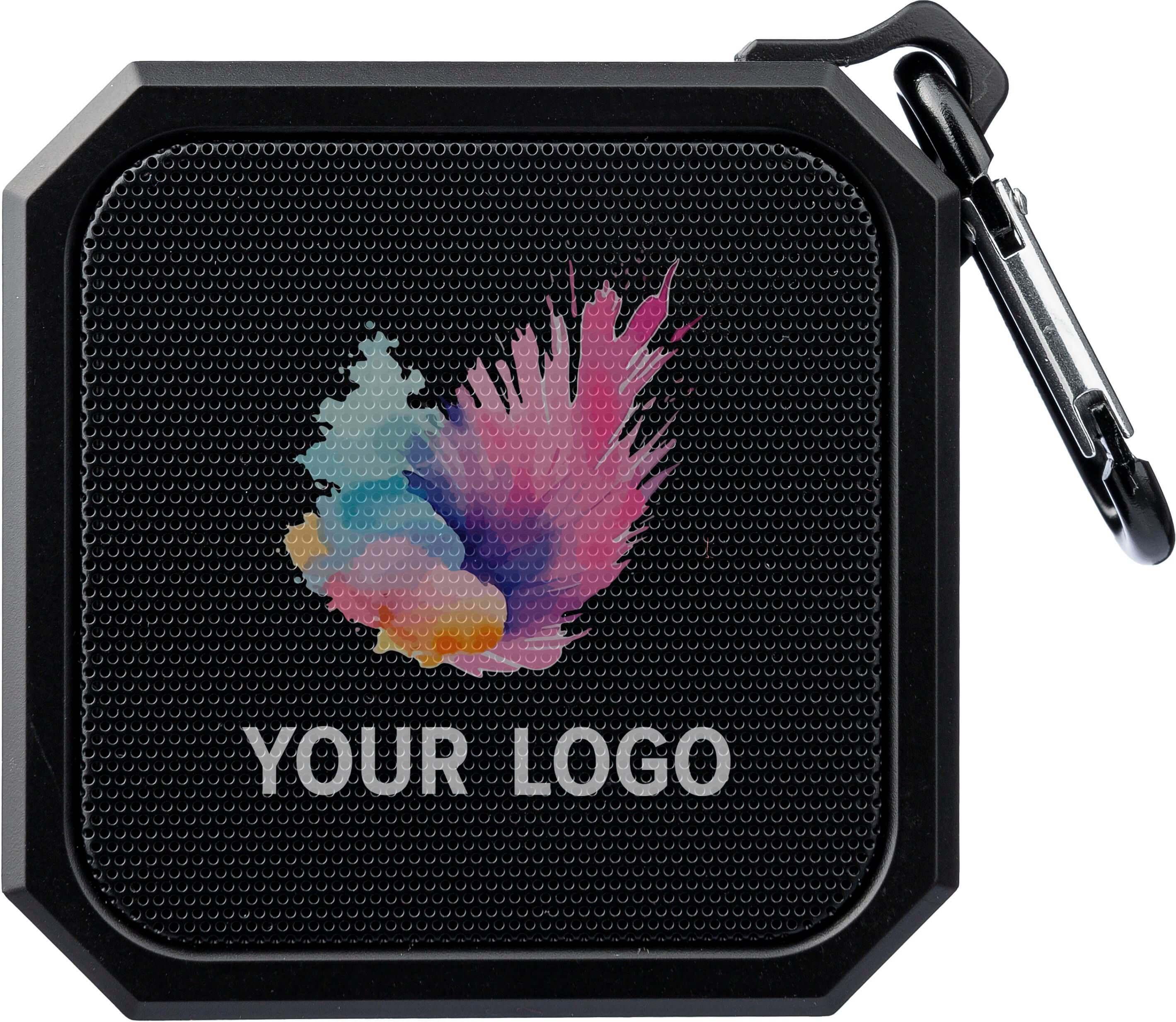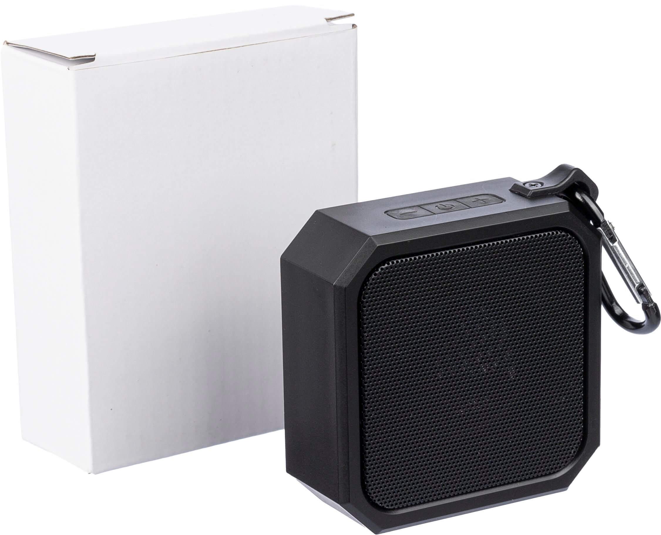 Alto-falante em ABS reciclado com mosquetão e clipe de plástico. Classificação IPX4. Saída de 3W, entrada DC 5V, bateria recarregável integrada de 300mAh, com 2 horas de autonomia. Distância de funcionamento de 15-20 metros, relação sinal/ruído de 87 dB. Gama de frequências: 100 Hz a 20 kHz. Inclui cabo de carregamento Tipo C de 50 cm. Tecnologia de ligação sem fios: 5.2. Apresentado individualmente numa caixa de cartão castanha.