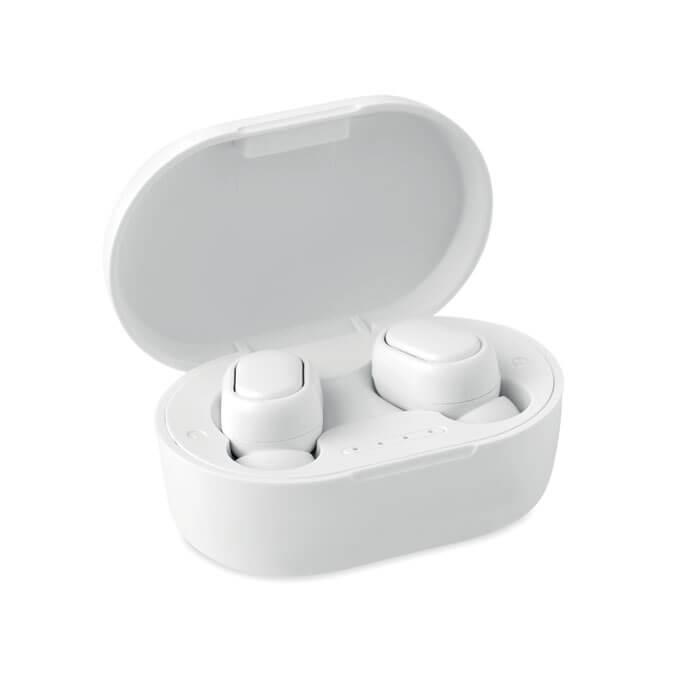 Auriculares estéreo sem fios True Wireless Stereo (TWS) em ABS reciclado 5.3 com microfone e bateria de 40 mAh incorporada. Tempo de reprodução de cerca de 4 horas. Emparelhamento automático. Inclui um cabo de carregamento micro USB e uma estação de carregamento de 300 mAh.