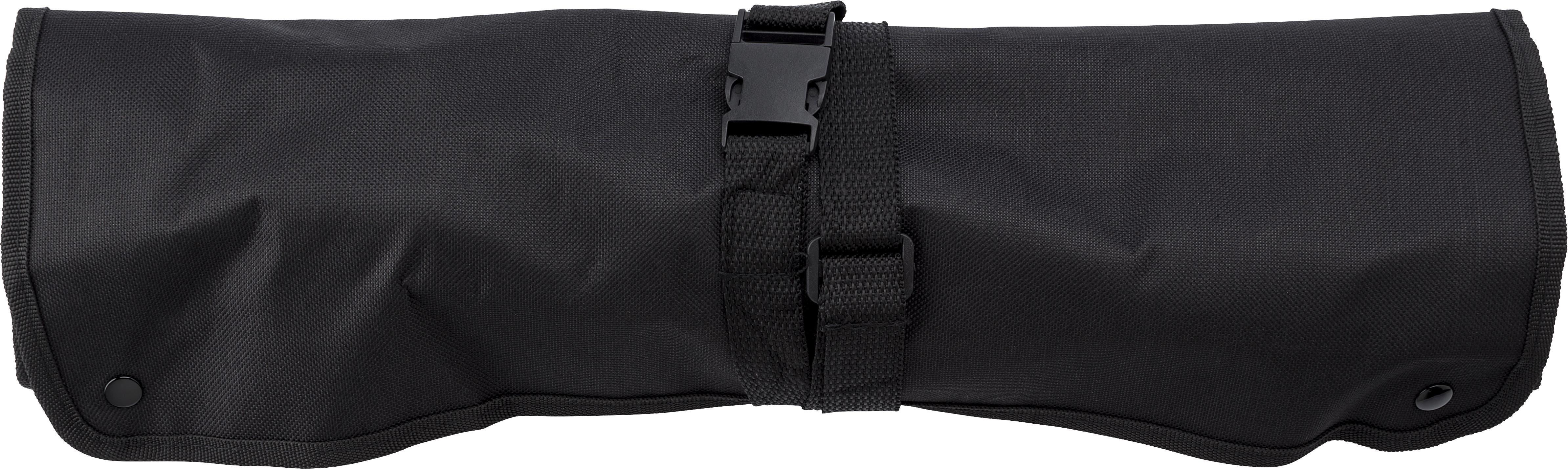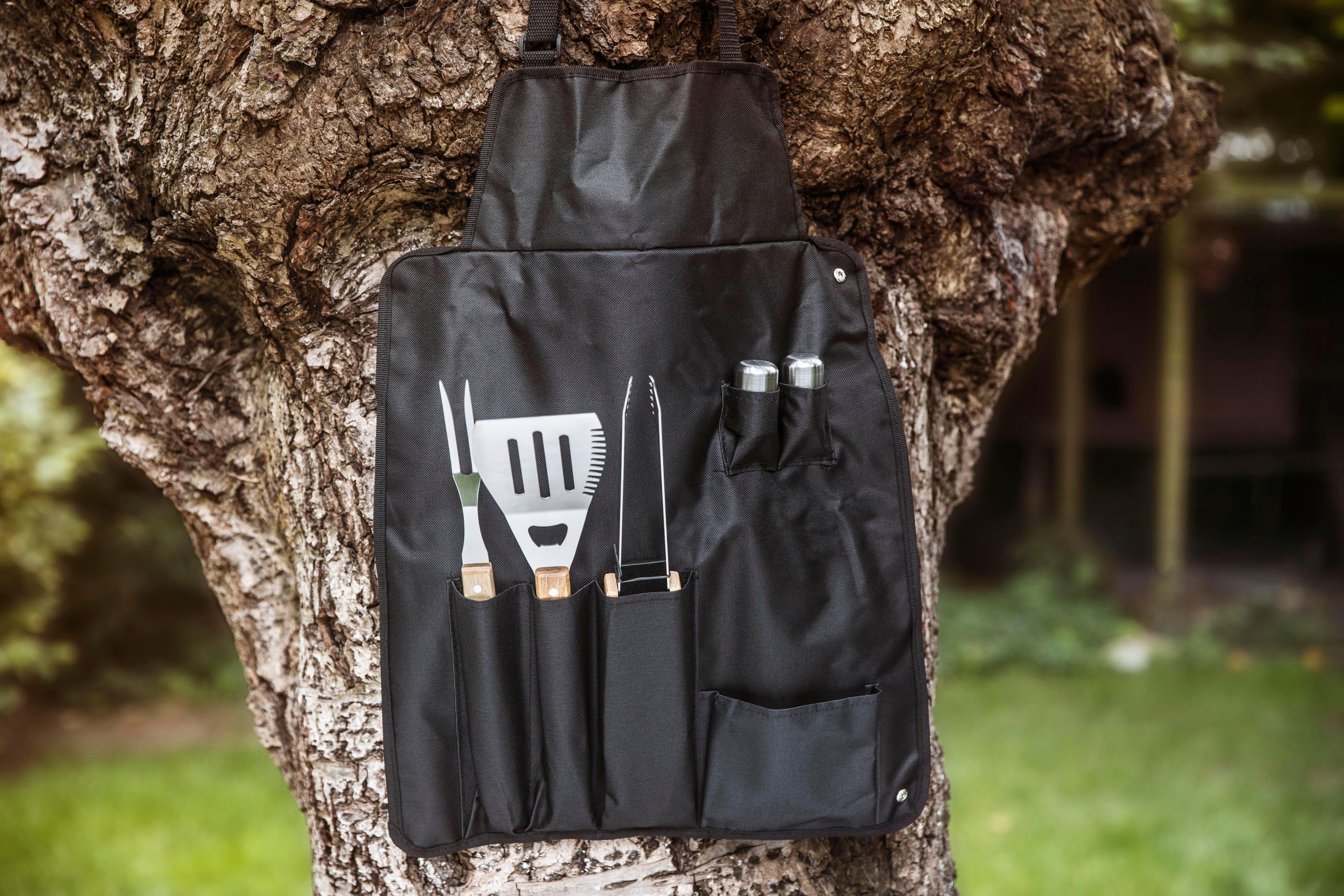 Conjunto de churrasco de seis peças de aço inoxidável, com a avental de nylon preto (600D) garfo grande, espátula, pinça e conjunto de sal e pimenta.