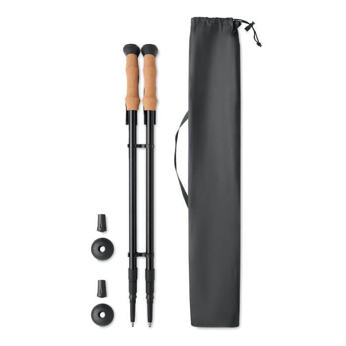 Bastões de caminhada nórdica totalmente ajustáveis em alumínio com pegas em cortiça, pontas de borracha para caminhar e cestos para lama. Apresentados numa bolsa RPET ripstop. Totalmente ajustável: 65 cm a 135 cm.