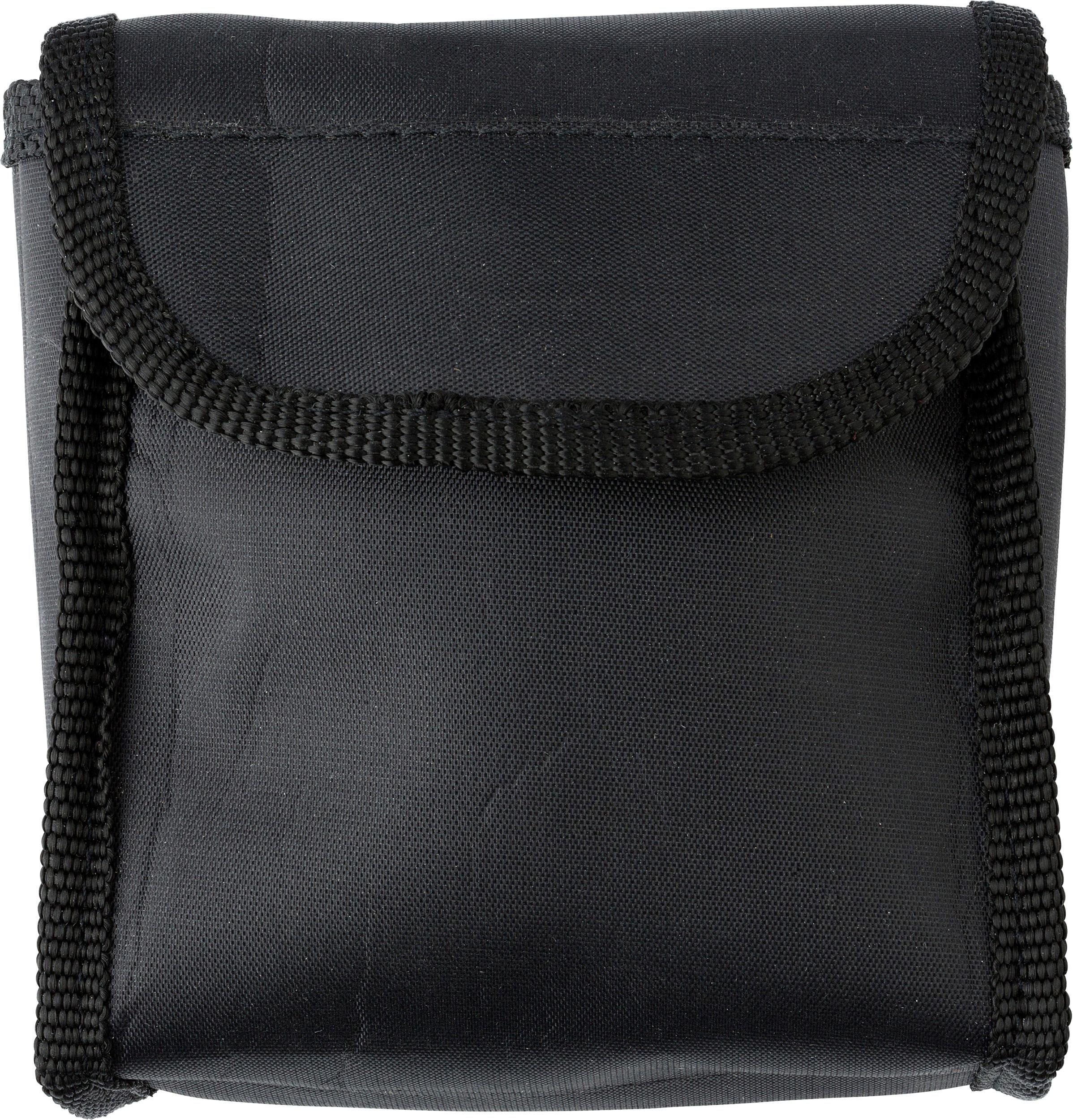 Binóculos de plástico e borracha 4 x 30 com pano de camurça para limpar. Apresentado em estojo de nylon com presilha para o cinto.