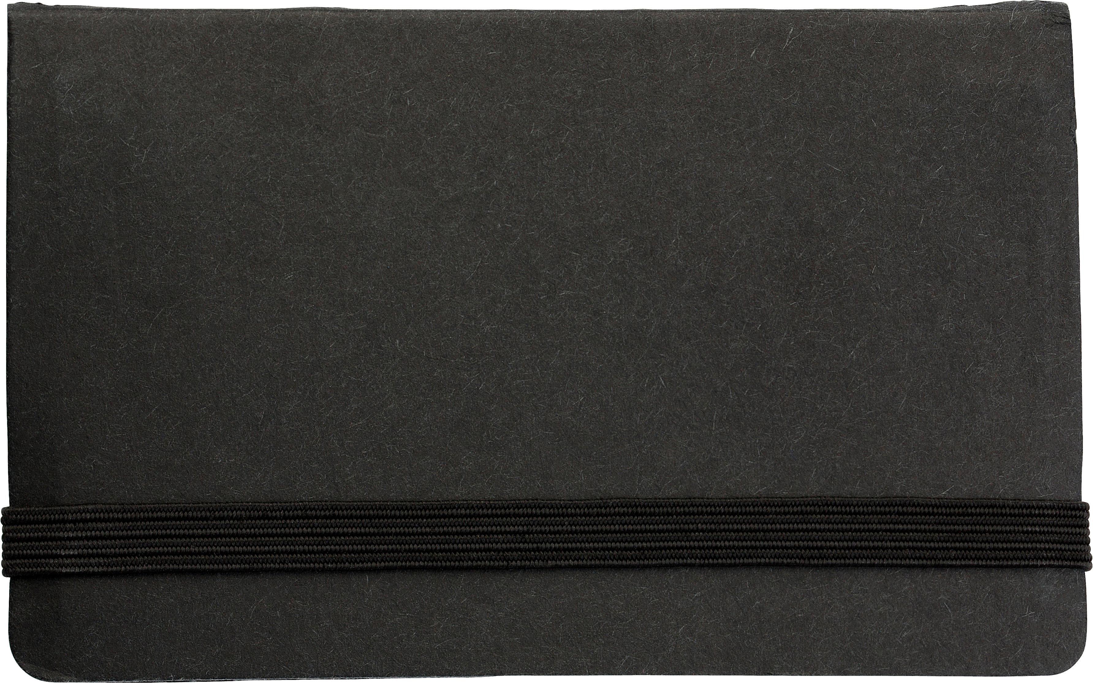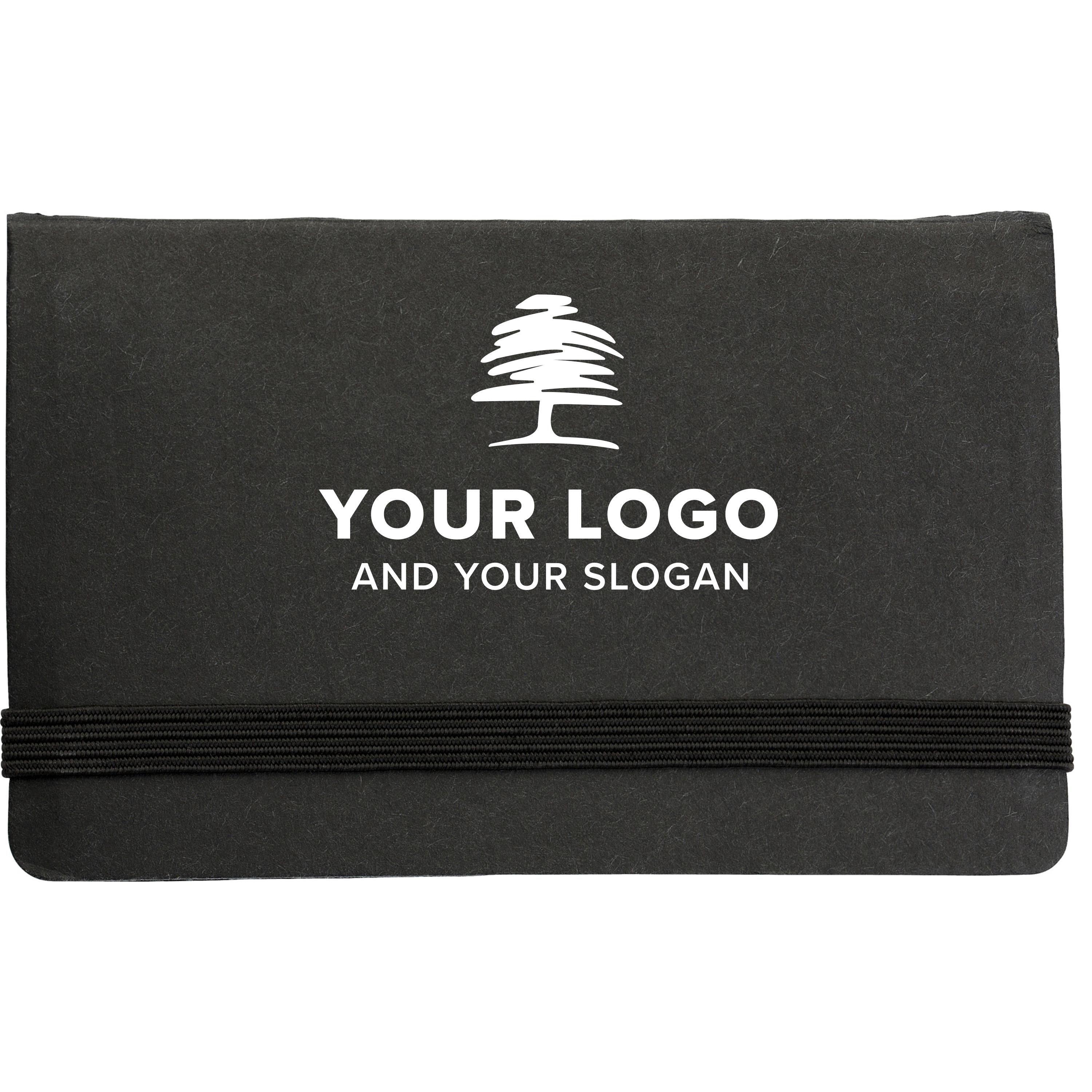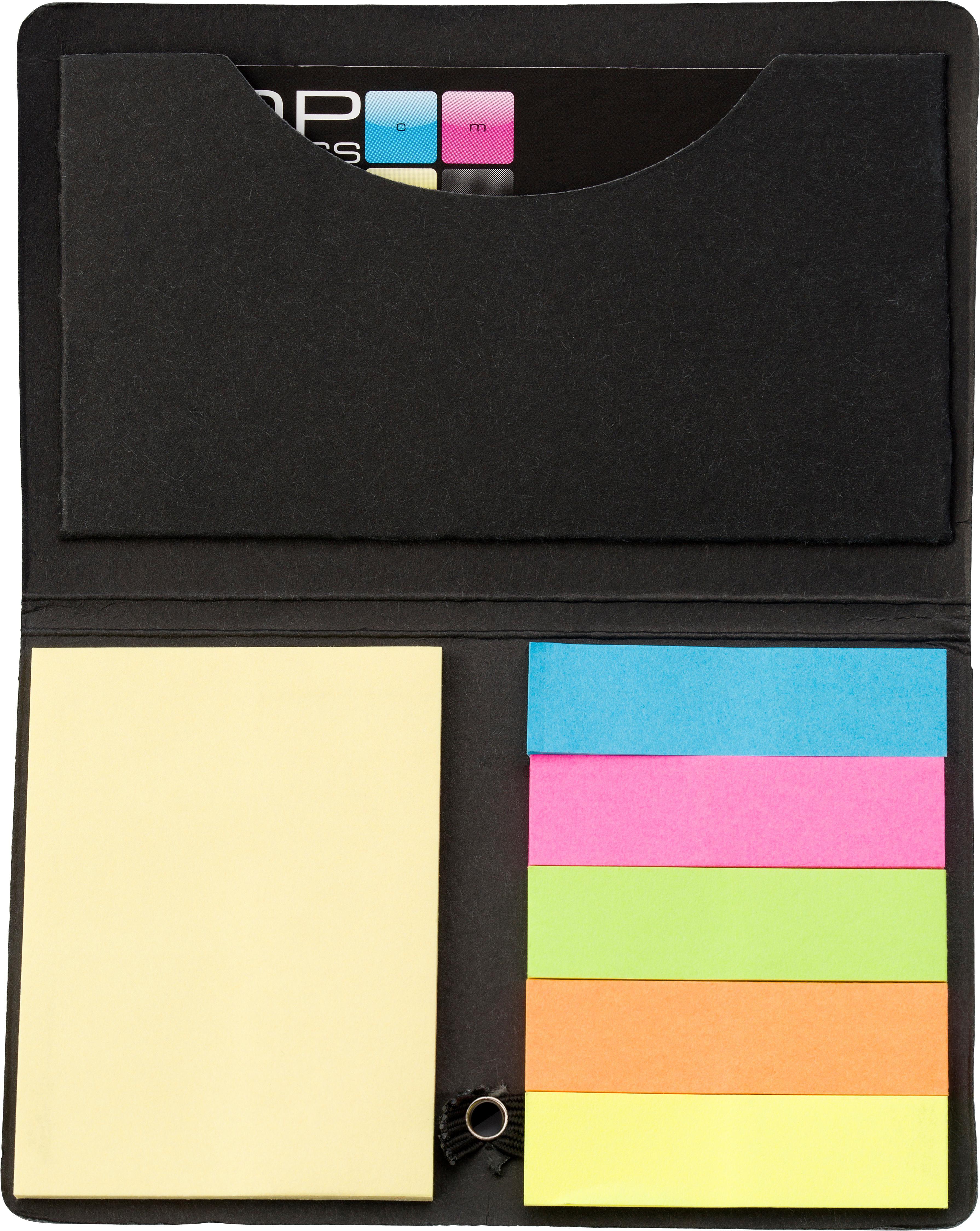 Estojo de cartão com 150 tiras e memos adesivos. Com bolso interno para os cartões de visita. O bloco de notas e as folhas de notas são certificados FSC® 100%. Fecho com elástico.