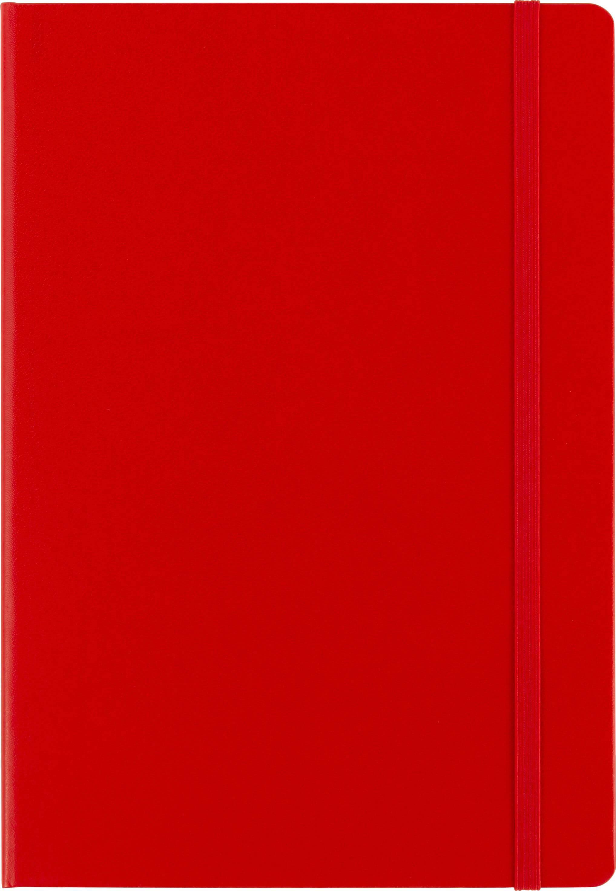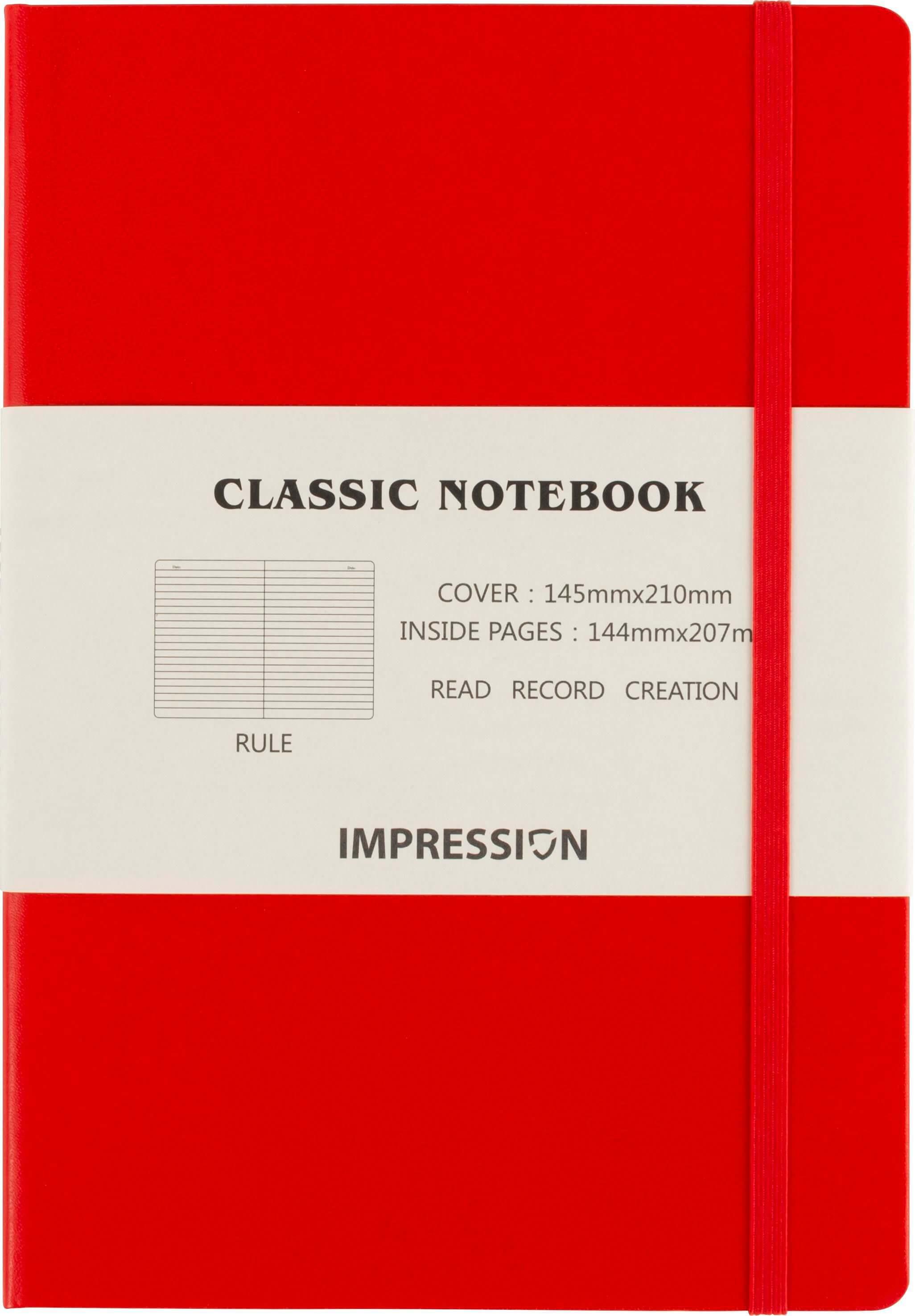 Bloco de cartão (aprox. A5) com fecho elástico. Inclui 128 páginas pautadas e a contracapa carrega um bolso interno de papel e um logotipo da IMPRESSION.