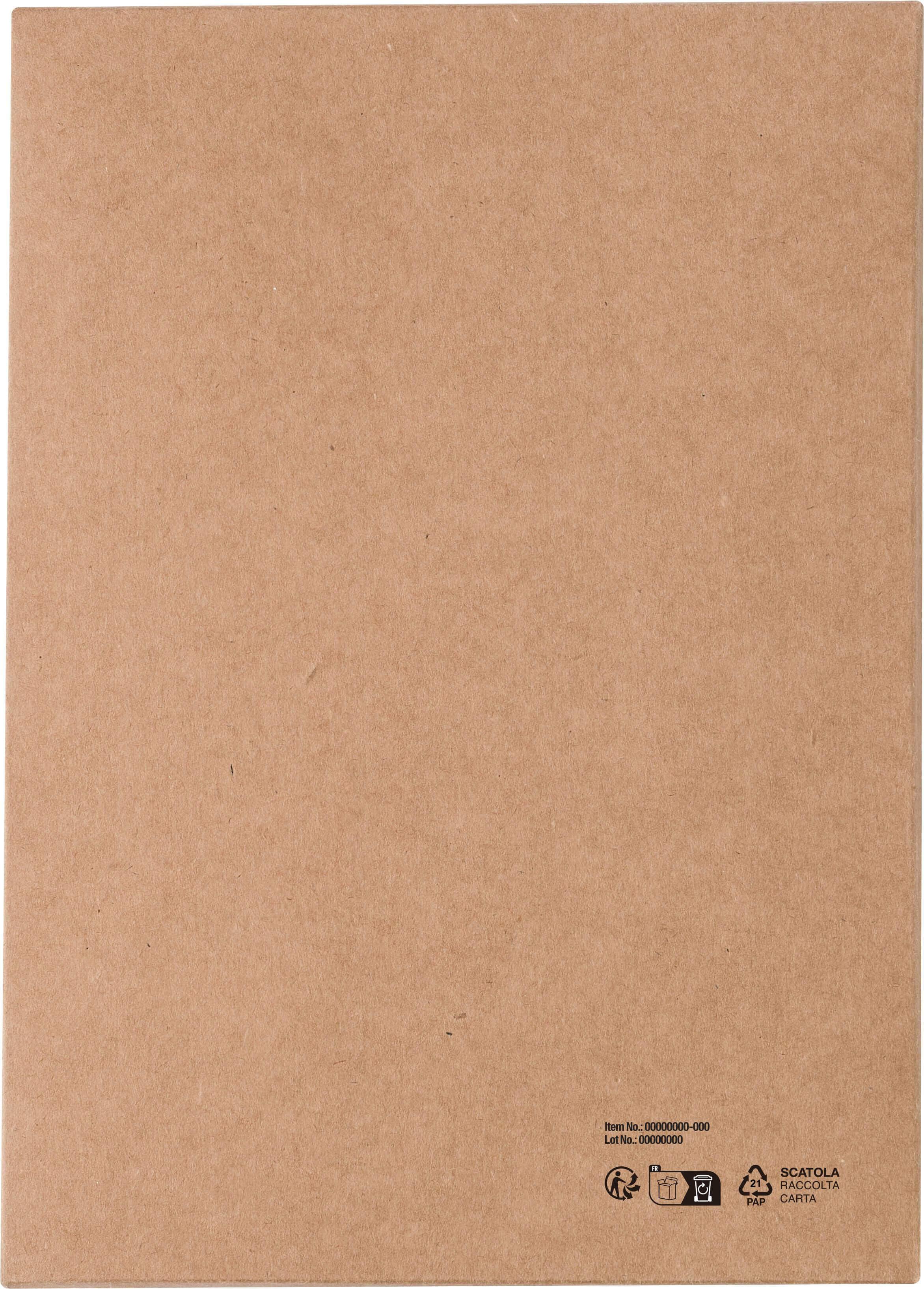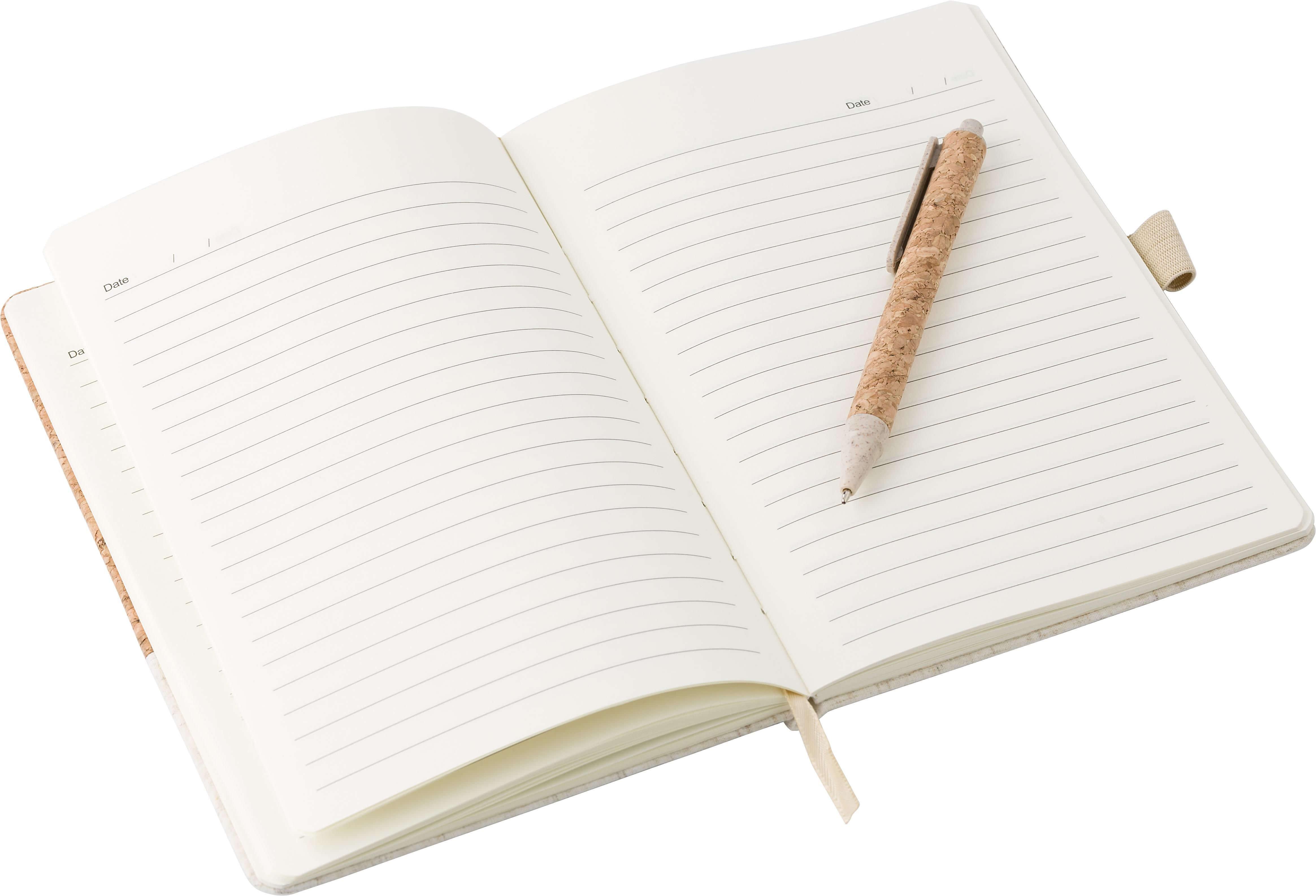 Bloco de cortiça e linho e esferográfica de palha de trigo em caixa de papel kraft. O papel neste caderno é certificado FSC® Mix. O caderno com fita elástica, esferográfica e 80 folhas pautadas com aviso de data. Escrita tinta azul