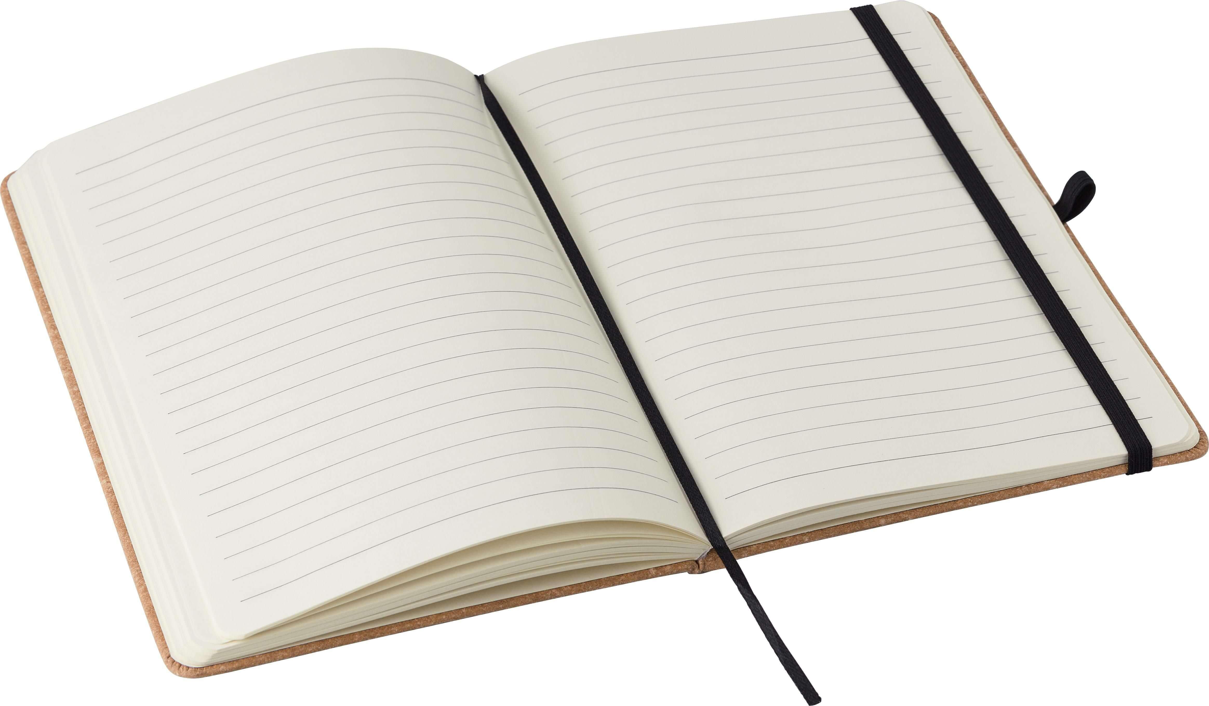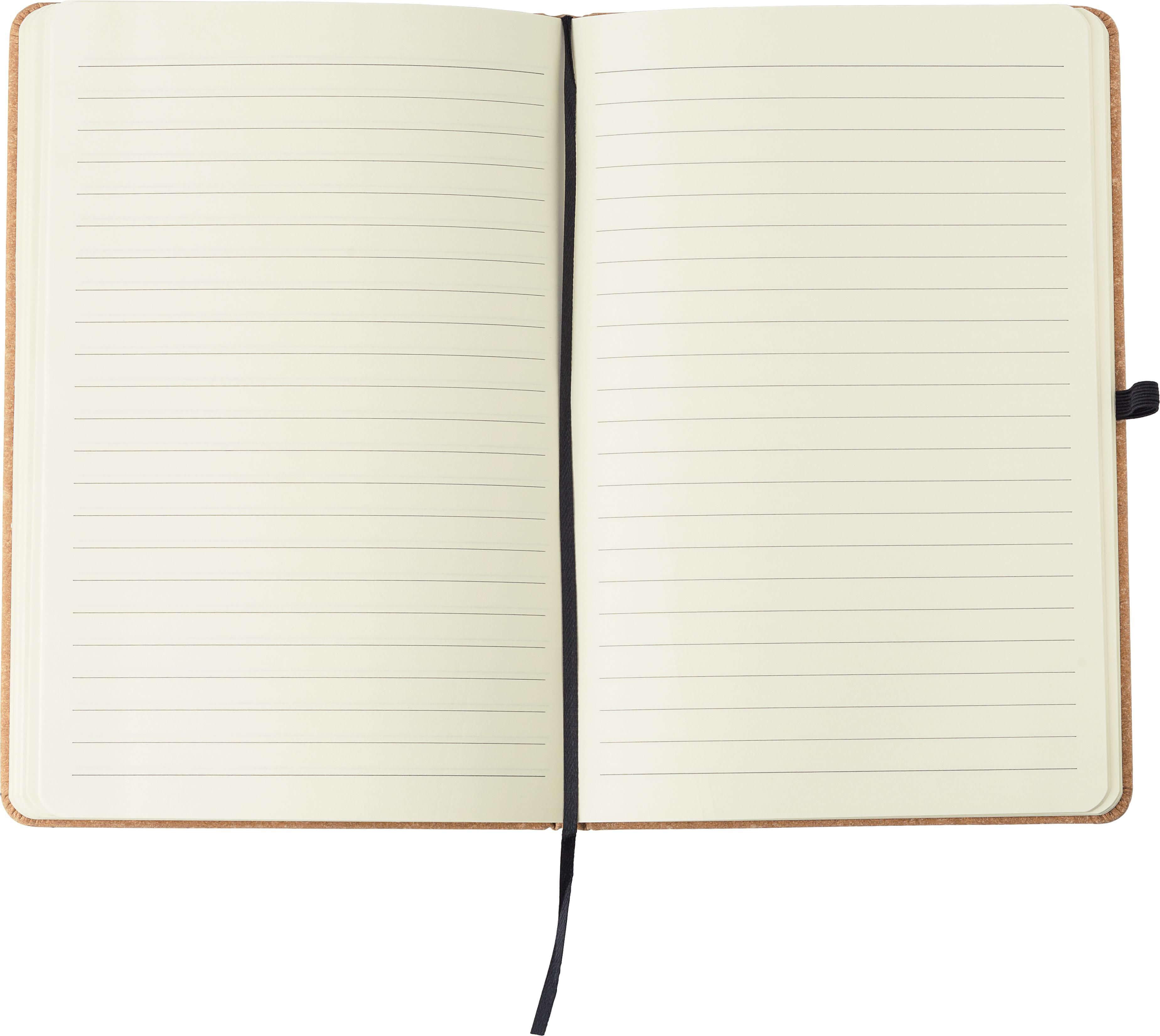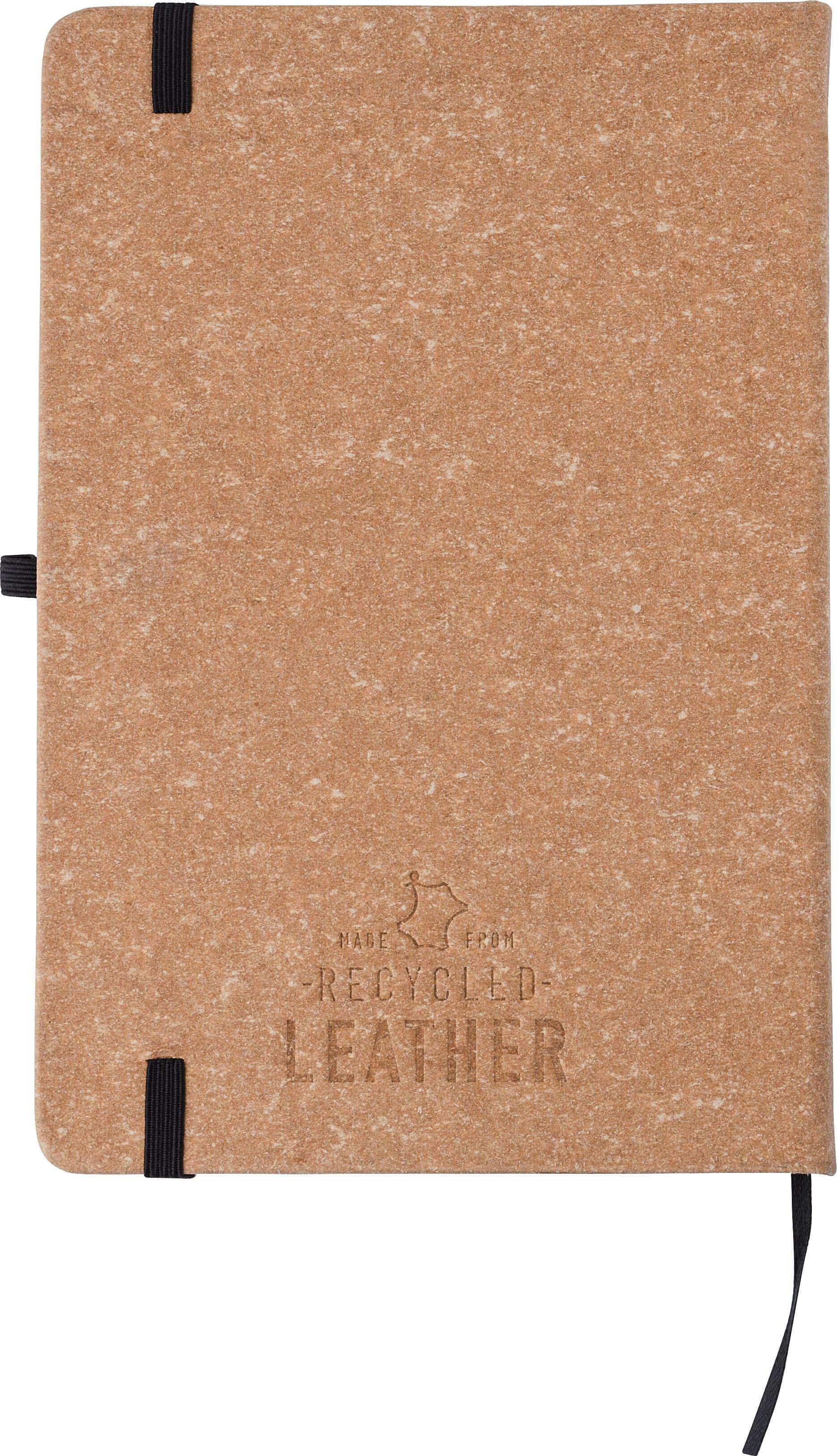 Bloco em pele reciclada (aprox. A5) com 200 folhas pautadas. Com fecho elástico, fita marca páginas, elástico para esferográfica e Logótipo ‘Recycled’ gravado no verso. O papel neste caderno é certificado FSC® Mix.