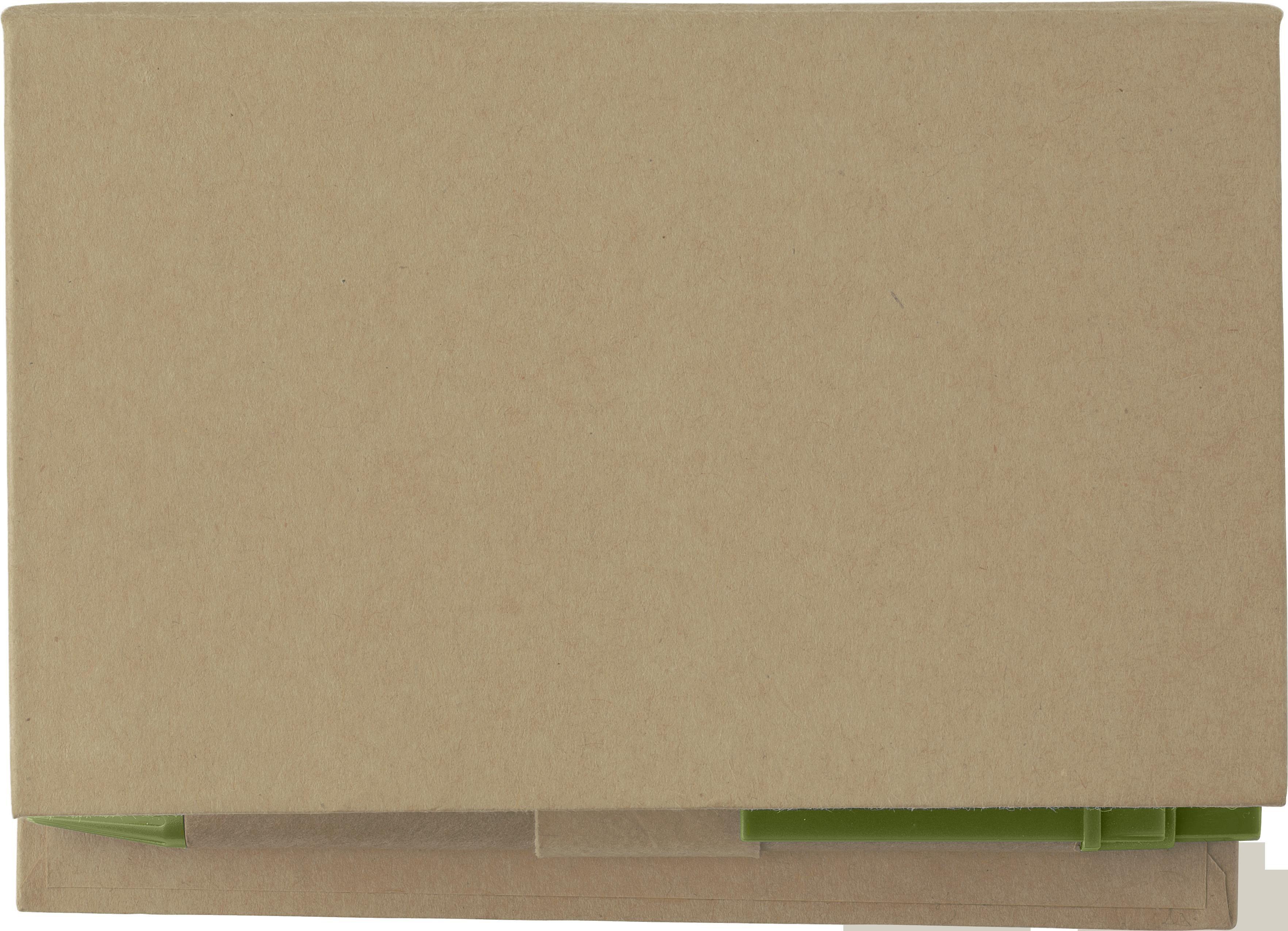 Estojo de cartão, contém: porta-cartões na tampa, 125 fitas adesivas, 160 folhas brancas de papel e esferográfica. Escrita em azul.