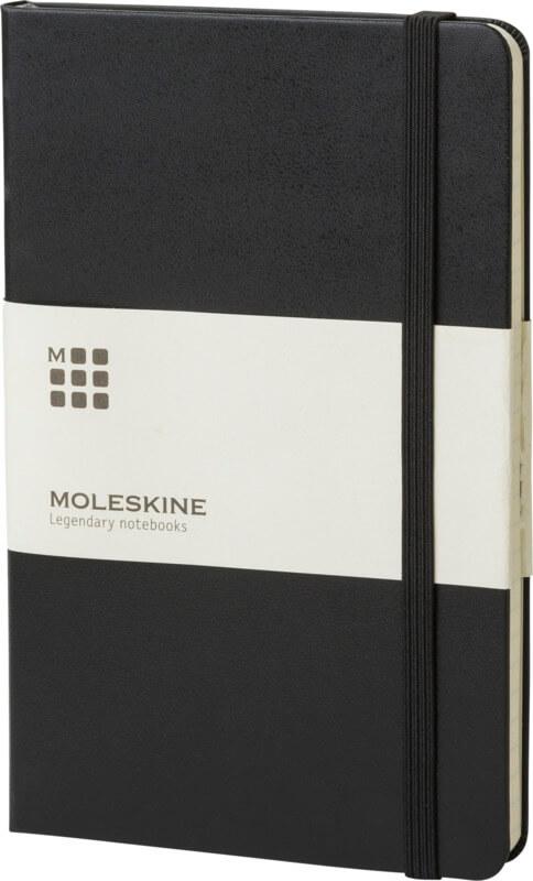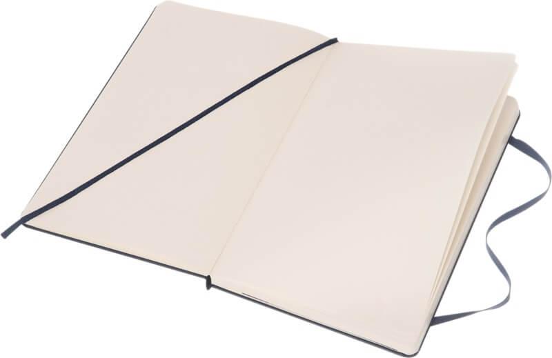 O bloco de notas de capa dura grande (13 x 21 cm) “Moleskine Classic” possui uma capa de cartão com cantos arredondados, papel sem ácido, marcador e fecho elástico. Na primeira página, existe um espaço para que possa anotar uma recompensa ou uma mensagem para quem o encontrar em caso de perda. Inclui um bolso interno expansível, anexado à contracapa, que contém a história da “Moleskine”. O bolso pode ser usado para colocar papéis soltos e notas. Contém 240 páginas lisas cor de marfim. Disponível numa variada gama de cores vibrantes e elegantes.