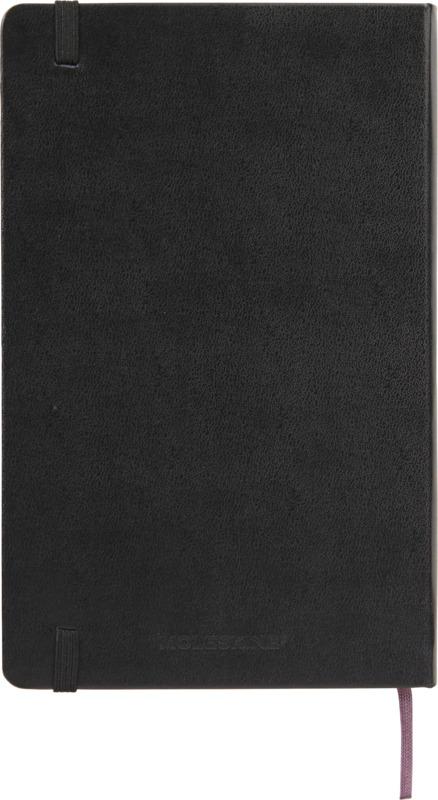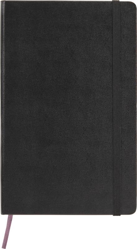 Bloco de notas de capa dura grande “Moleskine Classic” em preto best-seller, além de uma gama de cores vibrantes e elegantes. Possui cantos arredondados, fecho elástico e marcador de livro de fita. Bolso expansível em cartão e tecido no interior da contracapa. Contém 240 páginas quadriculadas de cor marfim.