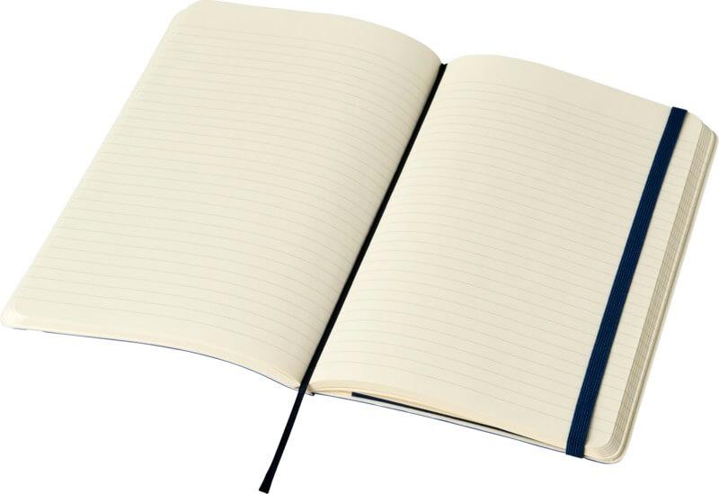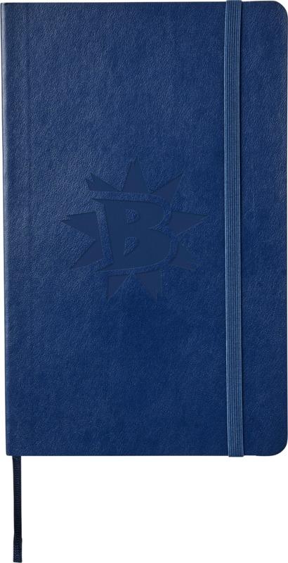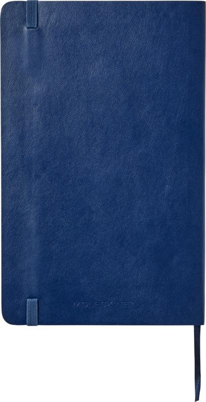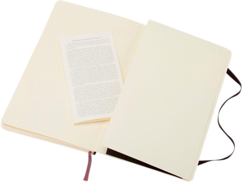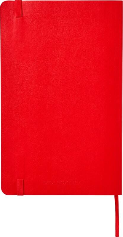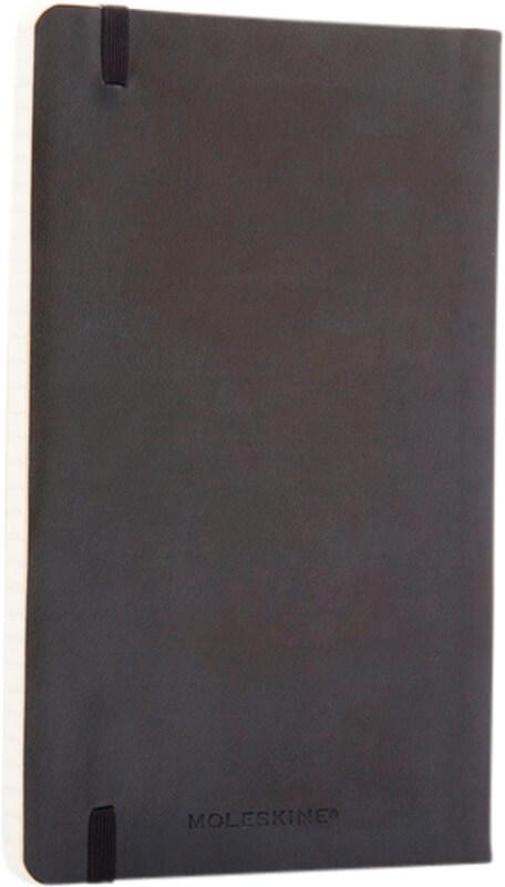 O bloco de notas de capa mole grande (13 x 21 cm) “Moleskine Classic” está disponível numa vasta gama de cores vibrantes e elegantes. O bloco de notas possui uma capa mole de cartão com cantos arredondados, papel sem ácido, marcador e fecho elástico. Na primeira página, existe um espaço para que possa anotar uma recompensa ou uma mensagem para quem o encontrar em caso de perda. Inclui um bolso interno expansível, anexado à contracapa, que contém a história da “Moleskine”. O bolso pode ser usado para colocar papéis soltos e notas. Contém 192 páginas pautadas de cor marfim.