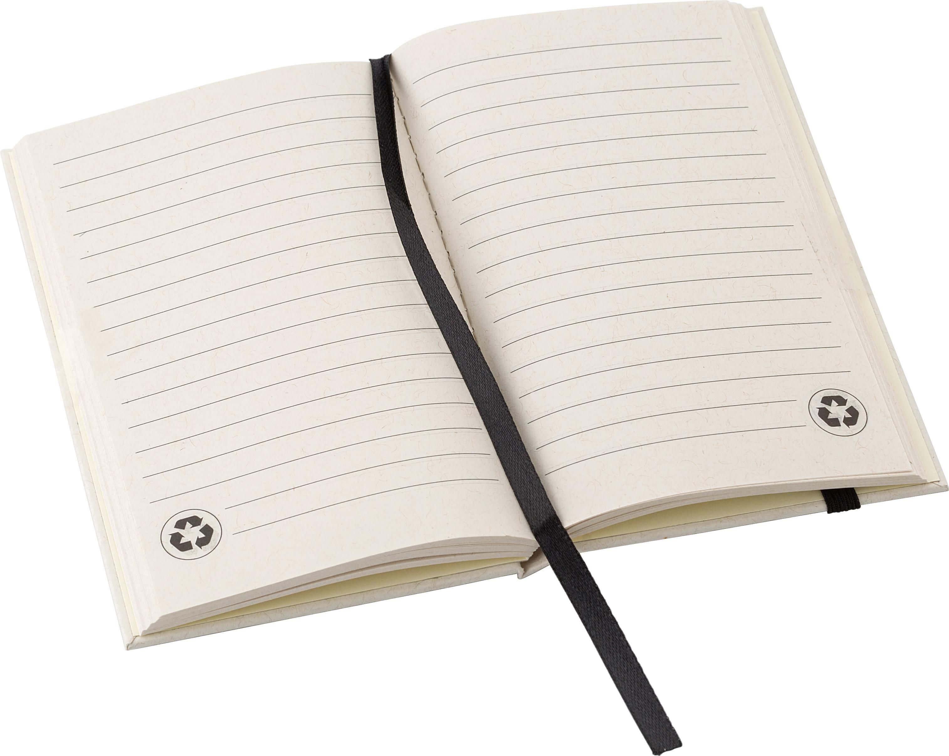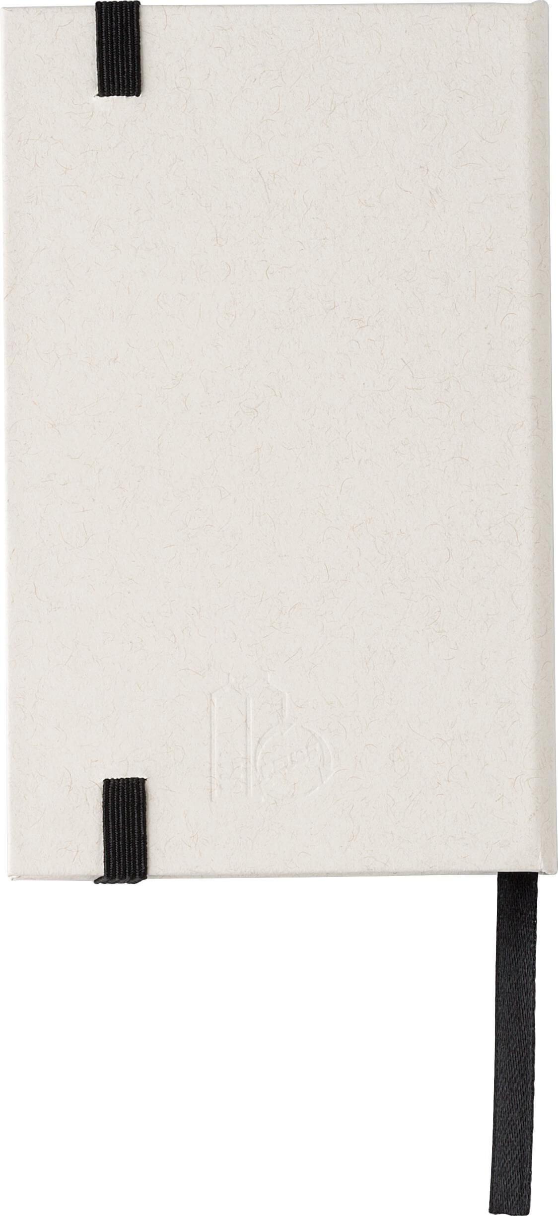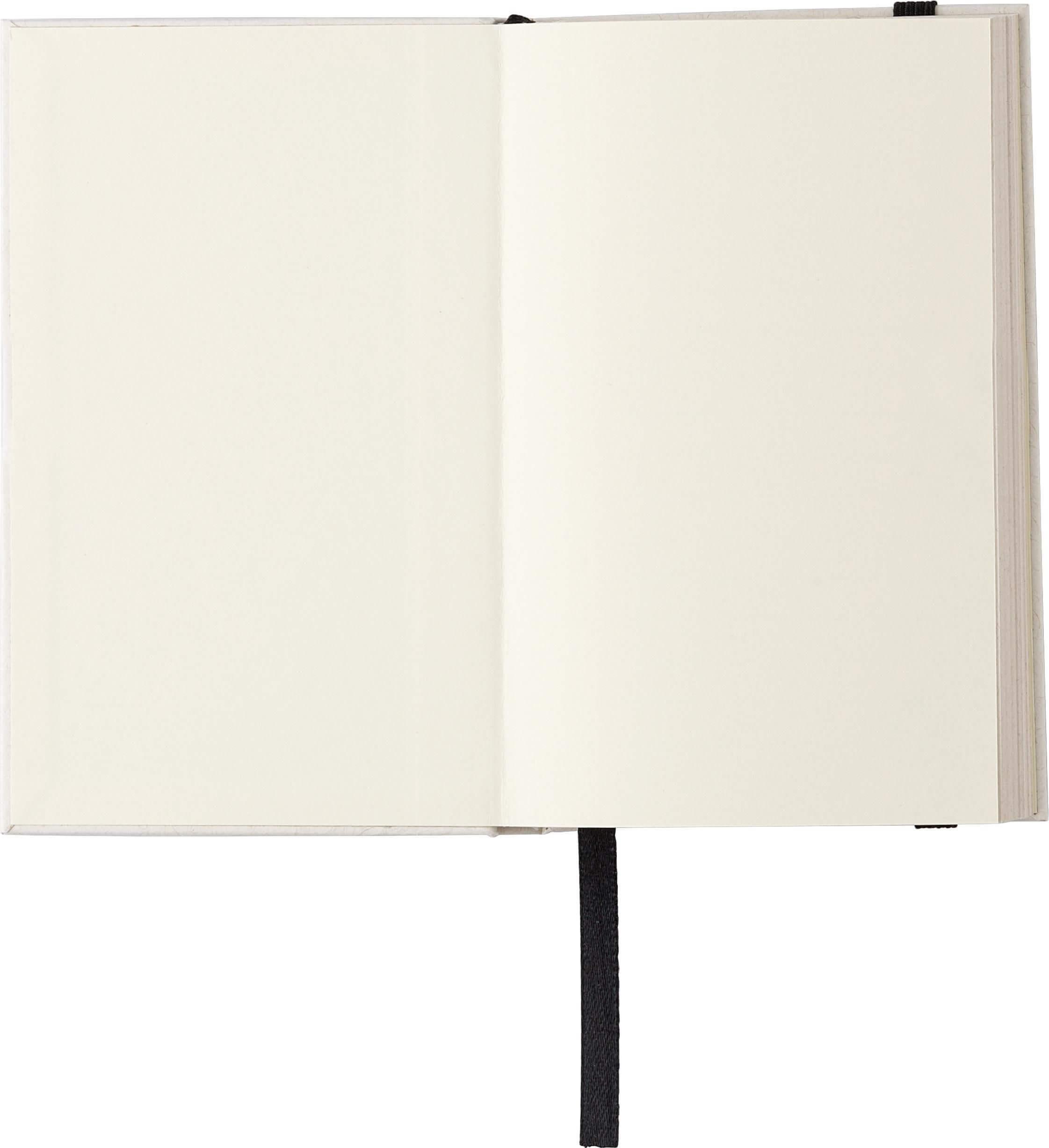 Caderno A6 com 80 folhas, elástico e fita. Fabricado com 70% de cartão de leite reciclado e 30% de papel reciclado. Inclui o logótipo do pacote de leite gravado a quente na parte inferior da capa.