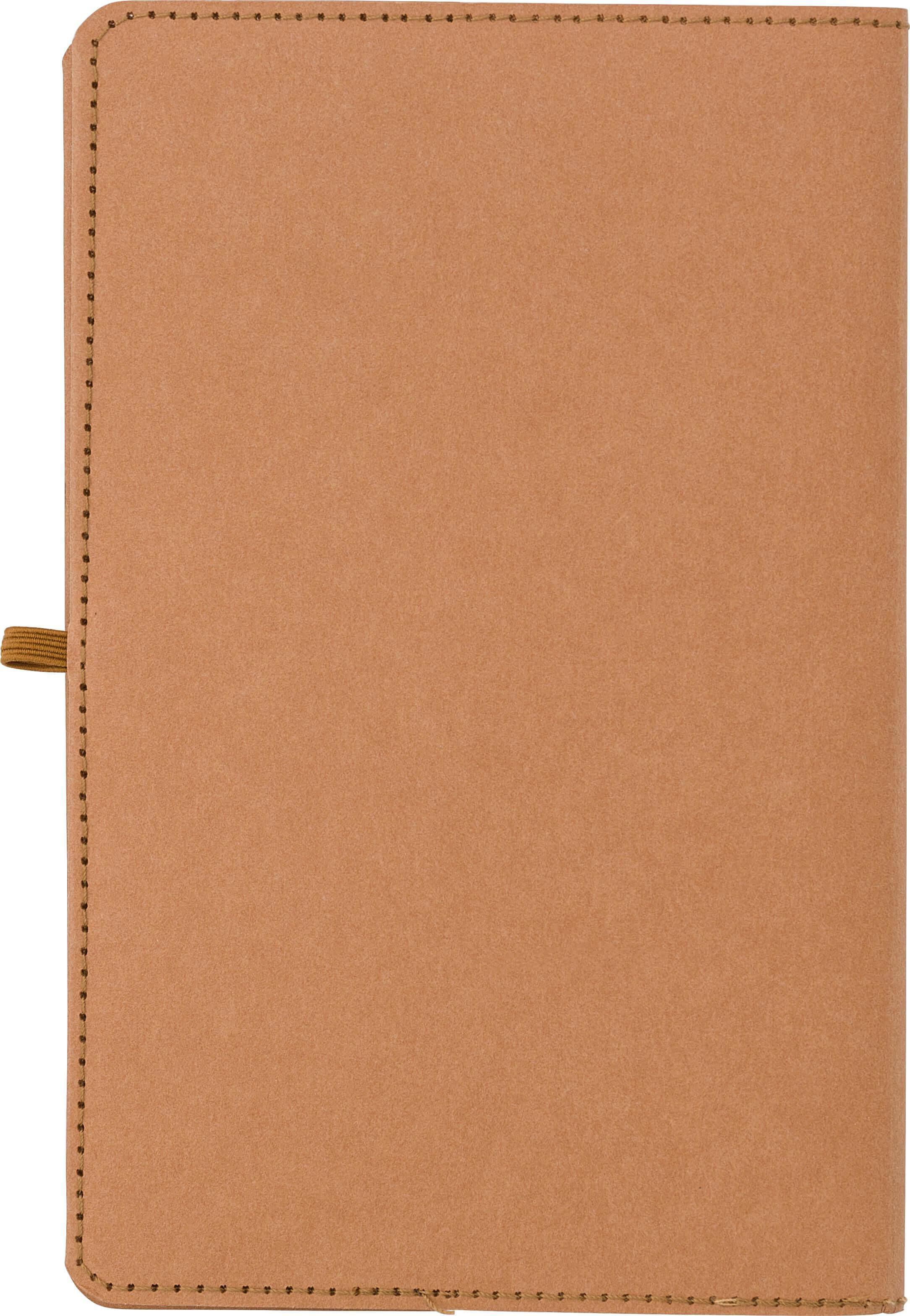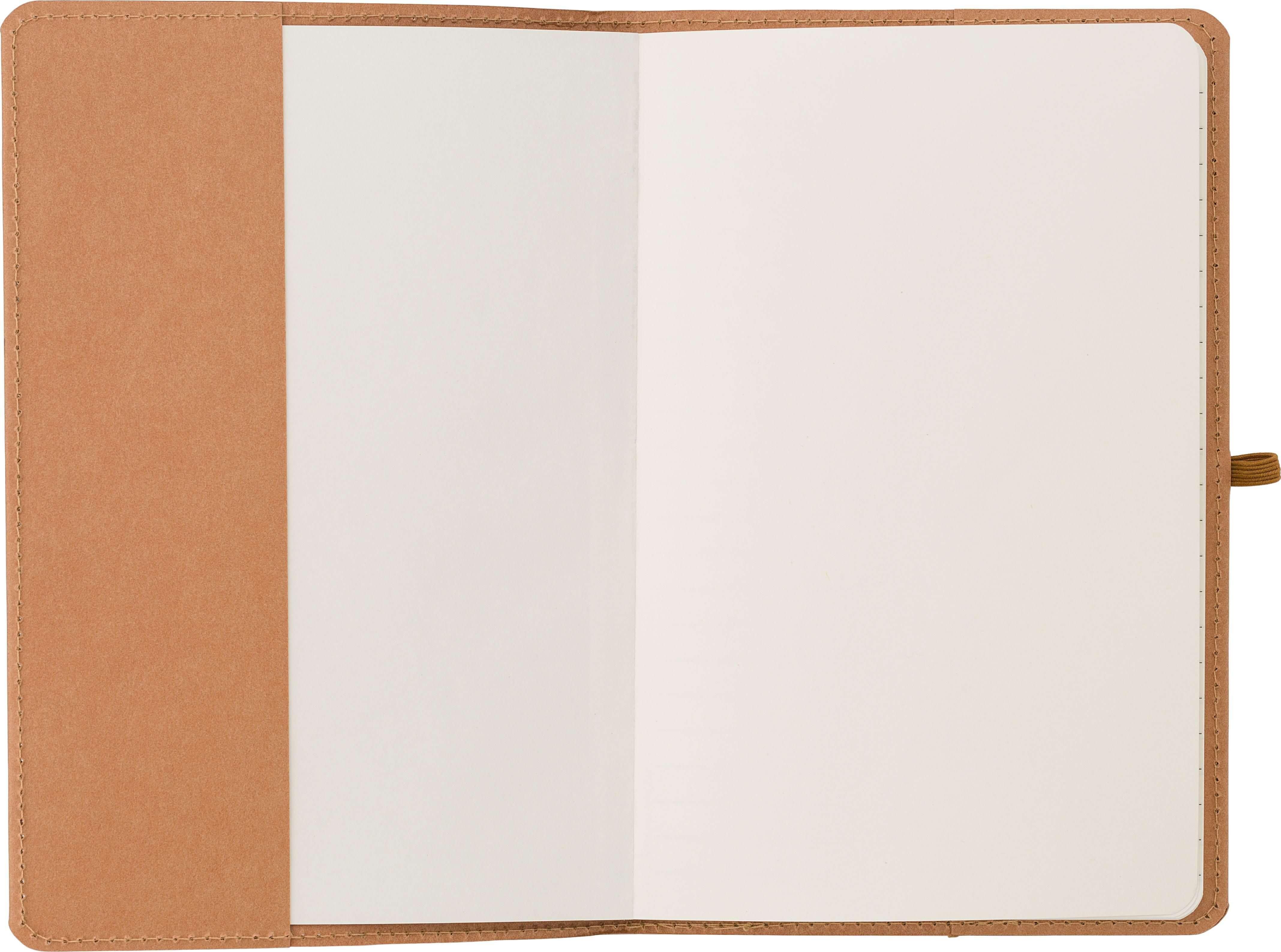 Caderno em papel kraft lavado (aprox. A5) com 96 folhas pautadas. O papel neste caderno é certificado FSC® Mix.
