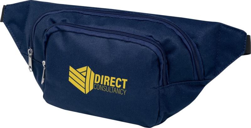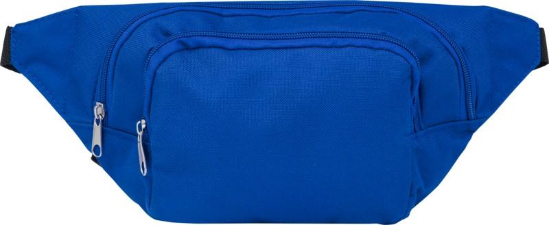 Dois grandes compartimentos com fecho. Faixa de cintura ajustável com fivela de abertura rápida.