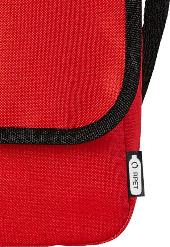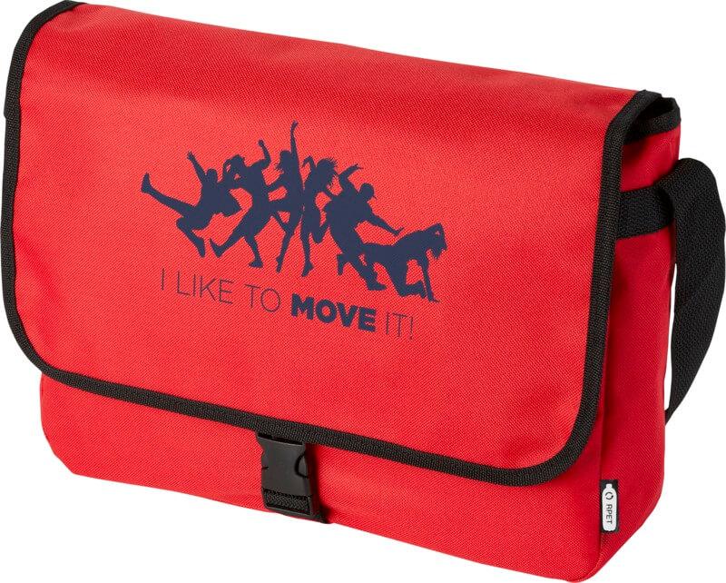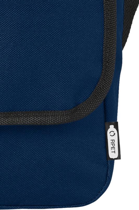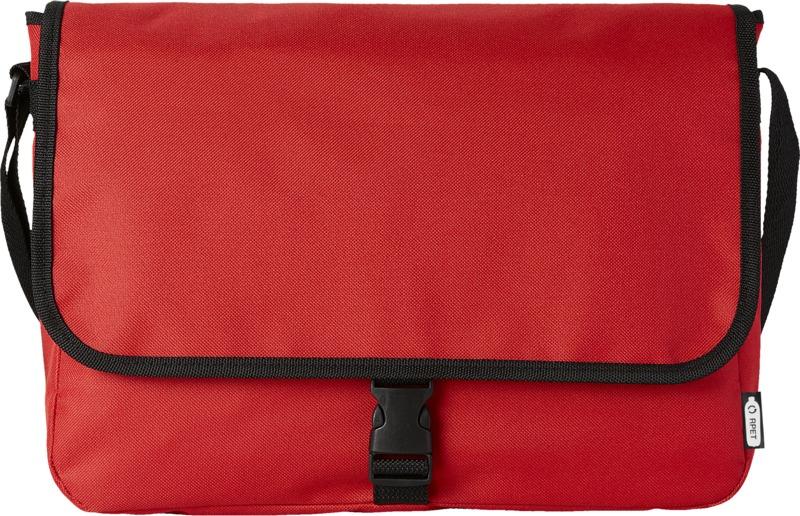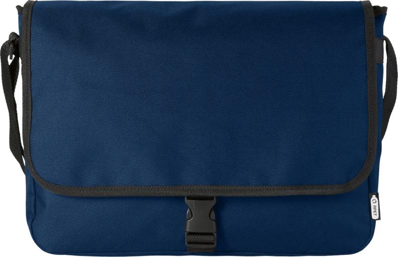 Bolsa de ombro feito de plástico PET reciclado com uma alça de ombro ajustável. Possui um compartimento principal que fecha com uma aba e um fecho de fivela.