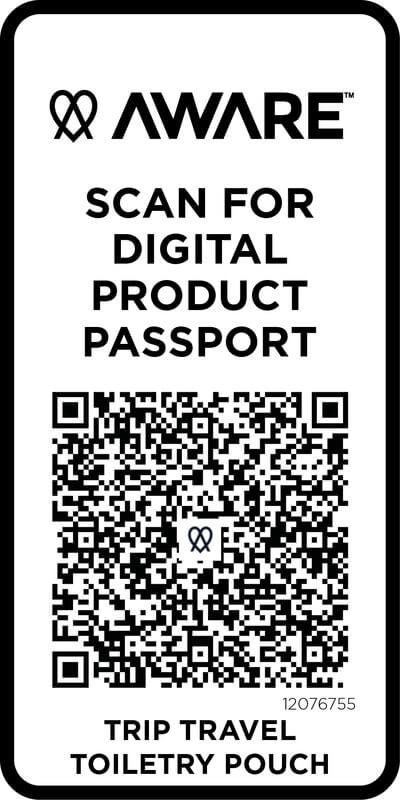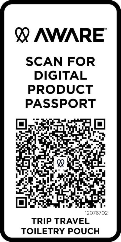 A bolsa de viagem reciclada para artigos higiénicos “Trip Aware™” é uma solução compacta e simples para transportar artigos essenciais do dia a dia. É feita de poliéster sarja 290D com revestimento traseiro em malha e forro com RPET 210D/PU e apresenta um design elegante e minimalista. O compartimento principal oferece espaço para artigos de higiene pessoal ou artigos pequenos, tornando-a ideal para viagens curtas ou organização em qualquer lugar. Cada saco também vem com um rastreador “Aware™”. Esta funcionalidade inovadora permite aos utilizadores rastrear as origens e o percurso do seu artigo através de um código QR, aumentando a transparência na cadeia de abastecimento e promovendo uma ligação mais forte entre o produto e o seu processo de produção. Capacidade volumétrica: 2 litros.