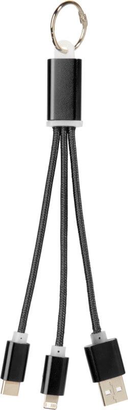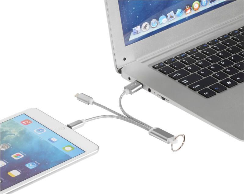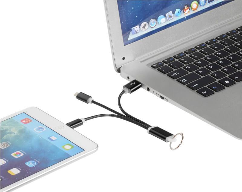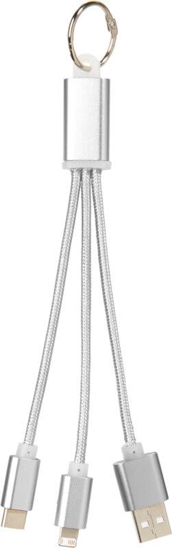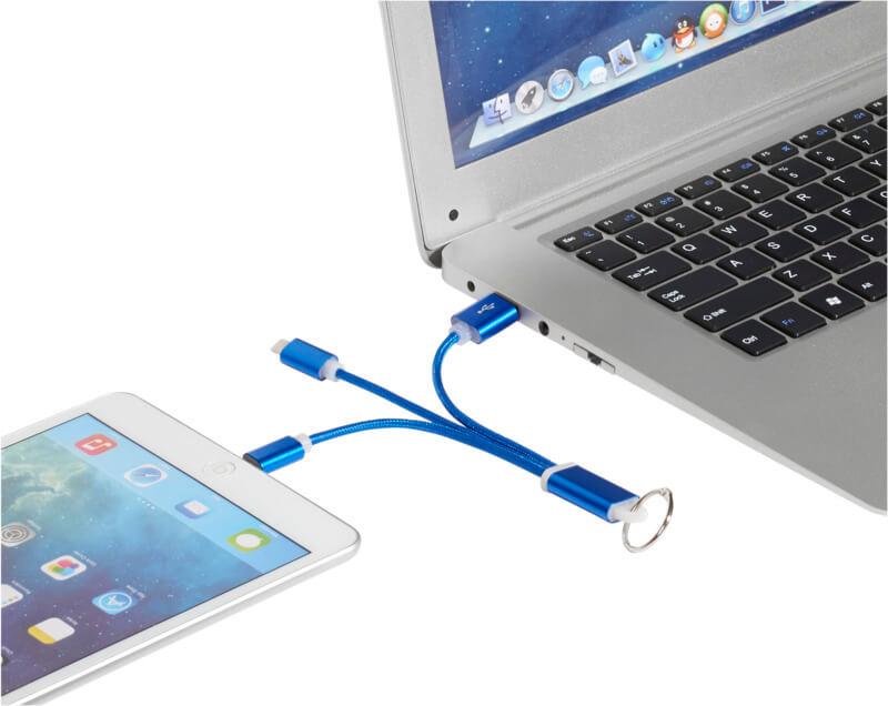 Cabo de Carregamento 3-em-1 de Metal com Porta-chaves. O Cabo de Carregamento 3-em-1 de Metal com Porta-chaves apresenta um 1 adaptador tipo C, 1 adaptador USB tipo A e uma ponta dupla 2-em-1 compatível com dispositivos Android e Apple iOS. Vem com um chaveiro. Para carregar dispositivos da Apple, coloque o cabo com o lado que não tem pinos no dispositivo, para carregar dispositivos Android, coloque o cabo com o lado que tem os pinos no dispositivo.