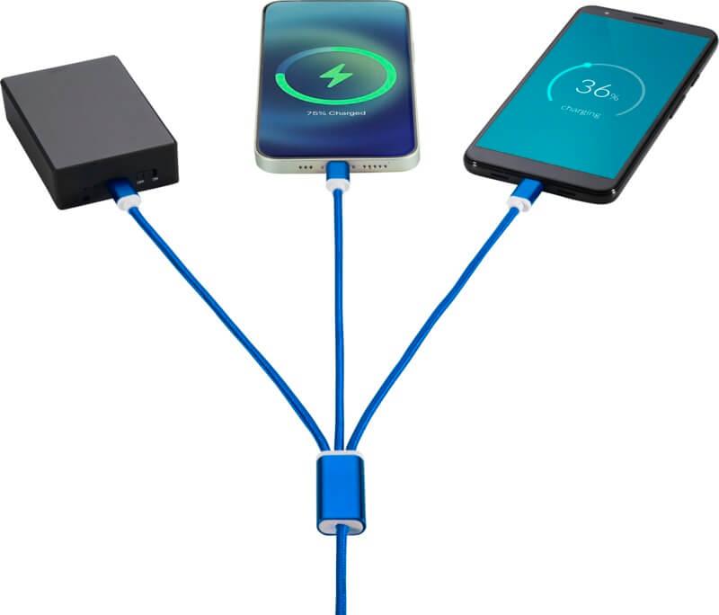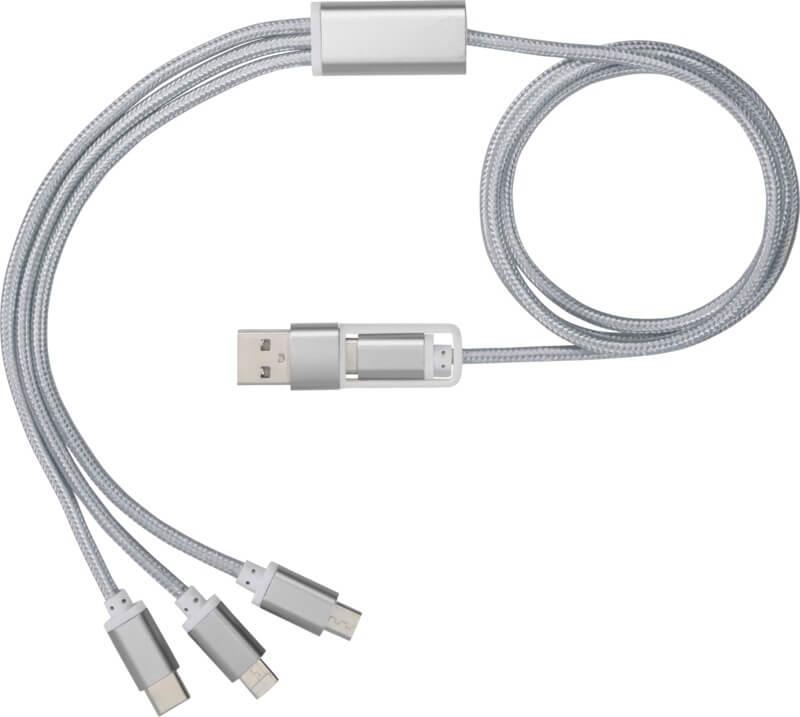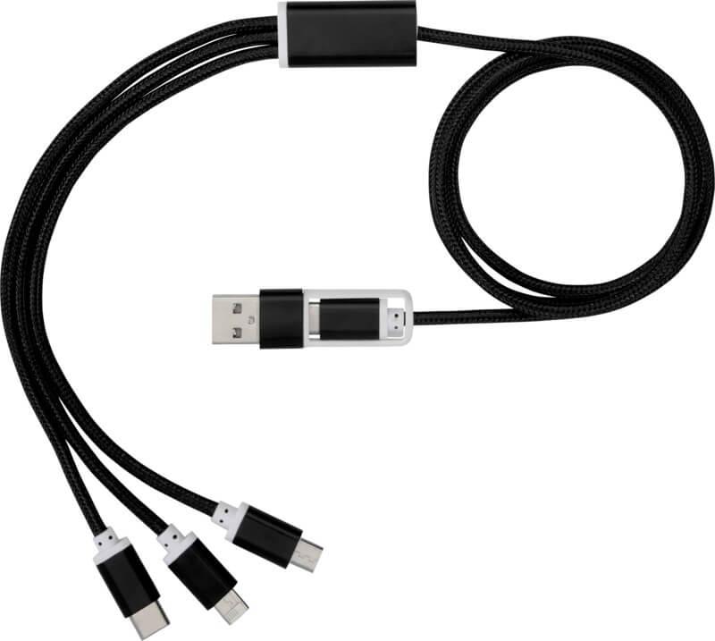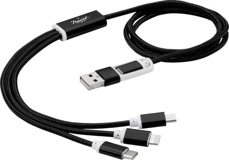 Cabo de carregamento de nylon trançado com 5 conectores diferentes: Entrada Tipo-C, entrada USB-A, saída Tipo-C, saída Apple® iOS e saída micro USB. Isto permite utilizar o cabo também com dispositivos de saída Tipo-C, que estão incluídos na geração mais recente de telefones e computadores MacBook. O comprimento do cabo é de 100 cm. Saída de ponta 2-em-1 até 2 A. Saída tipo-C até 3 A de corrente.