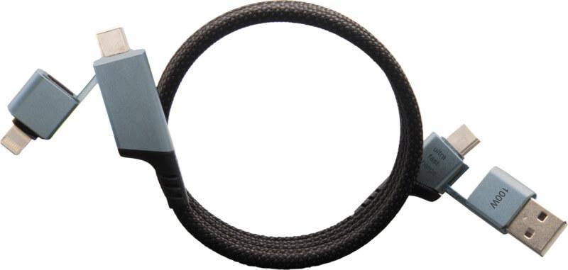 Cabo de carregamento magnético ultrarrápido 4 em 1 RPET de 100 W para carregar smartphones, tablets e computadores portáteis. A entrada dupla USB-A e USB-C torna o cabo 100 % compatível com os modelos de computador mais recentes. Saída: Tipo C e Lightning. Compatível com CarPlay. Inclui uma bolsa de TPU reciclável e folheto de papel reciclado. Comprimento do cabo: 1 metro.