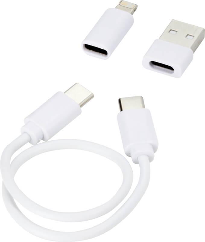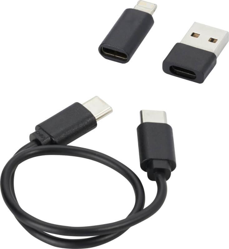 Cabo modular de transferência de dados e carregamento feito de plástico reciclado, entregue numa elegante caixa de armazenamento. O cabo oferece várias soluções de carregamento: Entrada Tipo C e USB-A e saída Tipo C/iOS/micro USB. Graças a todos estes adaptadores e conectores, este cabo permite carregar a maioria dos smartphones, câmaras, powerbanks, auriculares, etc. O cabo tem uma potência de saída máxima de 2 A. Possui um pino de ejeção que é útil sempre que você precisar de retirar o cartão SIM do seu telemóvel. A caixa de armazenamento também tem espaço para armazenar um cartão de memória micro SD e um cartão nano SIM, tornando-o o acessório de viagem perfeito. Comprimento do cabo: 28 cm. Fornecido num envelope de papel kraft 100 % reciclado.