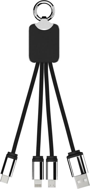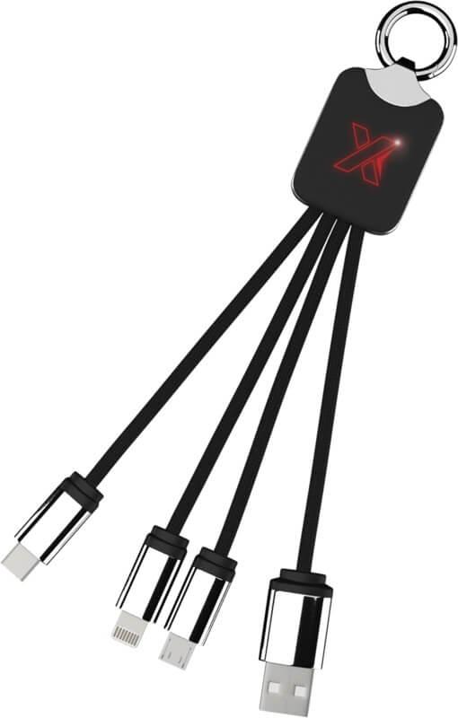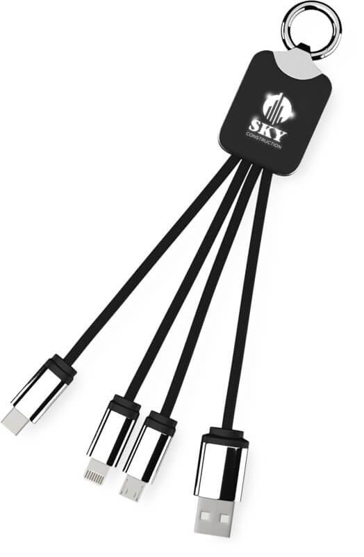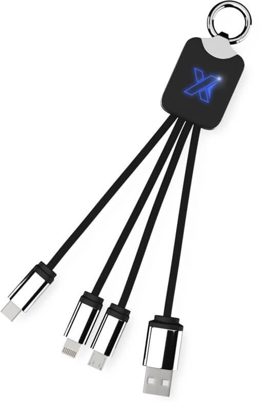 Cabo de carregamento com logótipo retroiluminado, com acabamento em borracha e metal, equipado com três conetores (Tipo C, Android, iPhone). Podem ser carregados até três dispositivos em simultâneo. Comprimento dos cabos (incluindo as fichas): 10 cm. Comprimento total do cabo: 1 metro. O cabo de RPET e embalagem são de papel reciclado e plástico reciclado.