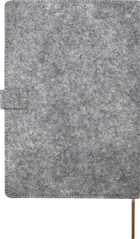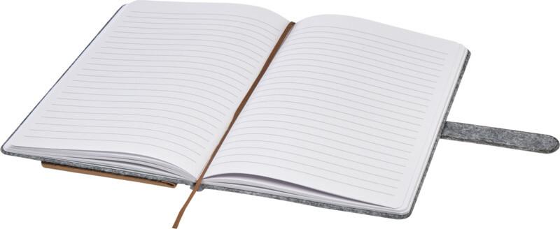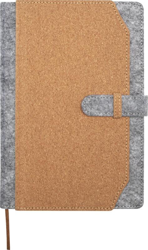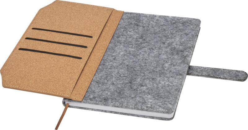 Bloco de notas A5 de capa dura de feltro reciclado e cortiça com 80 folhas pautadas de papel de 70 g/m². O bloco de notas inclui três bolsos para cartões de visita, fita castanha a condizer e cantos arredondados.