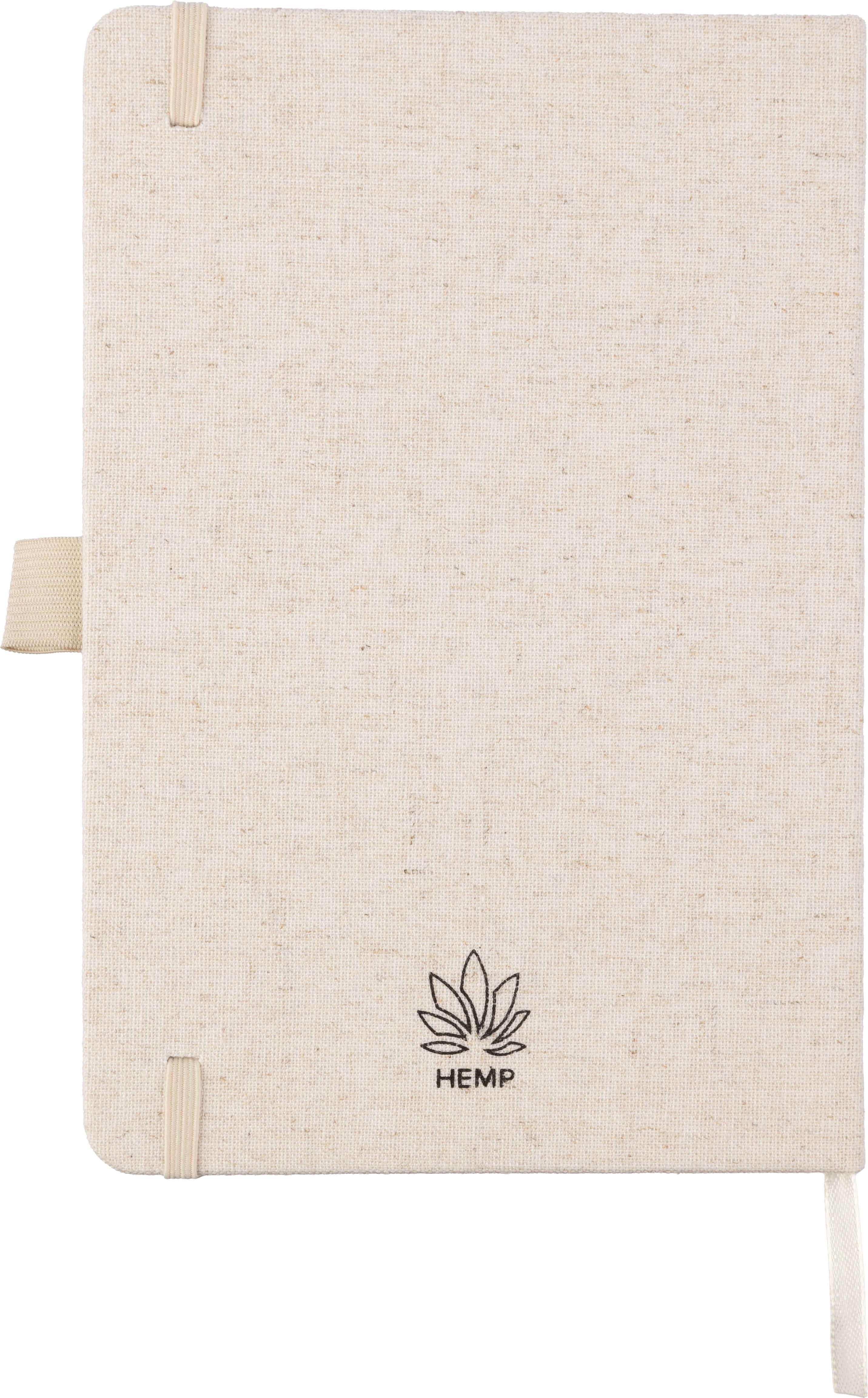 Caderno de cânhamo (aprox. A5) com 80 páginas, com suporte para esferográfica, elástico e fita em uma cor natural à copndizer. O papel neste caderno é certificado FSC® Mix. Inclui um logotipo de cânhamo na parte de trás da capa.
