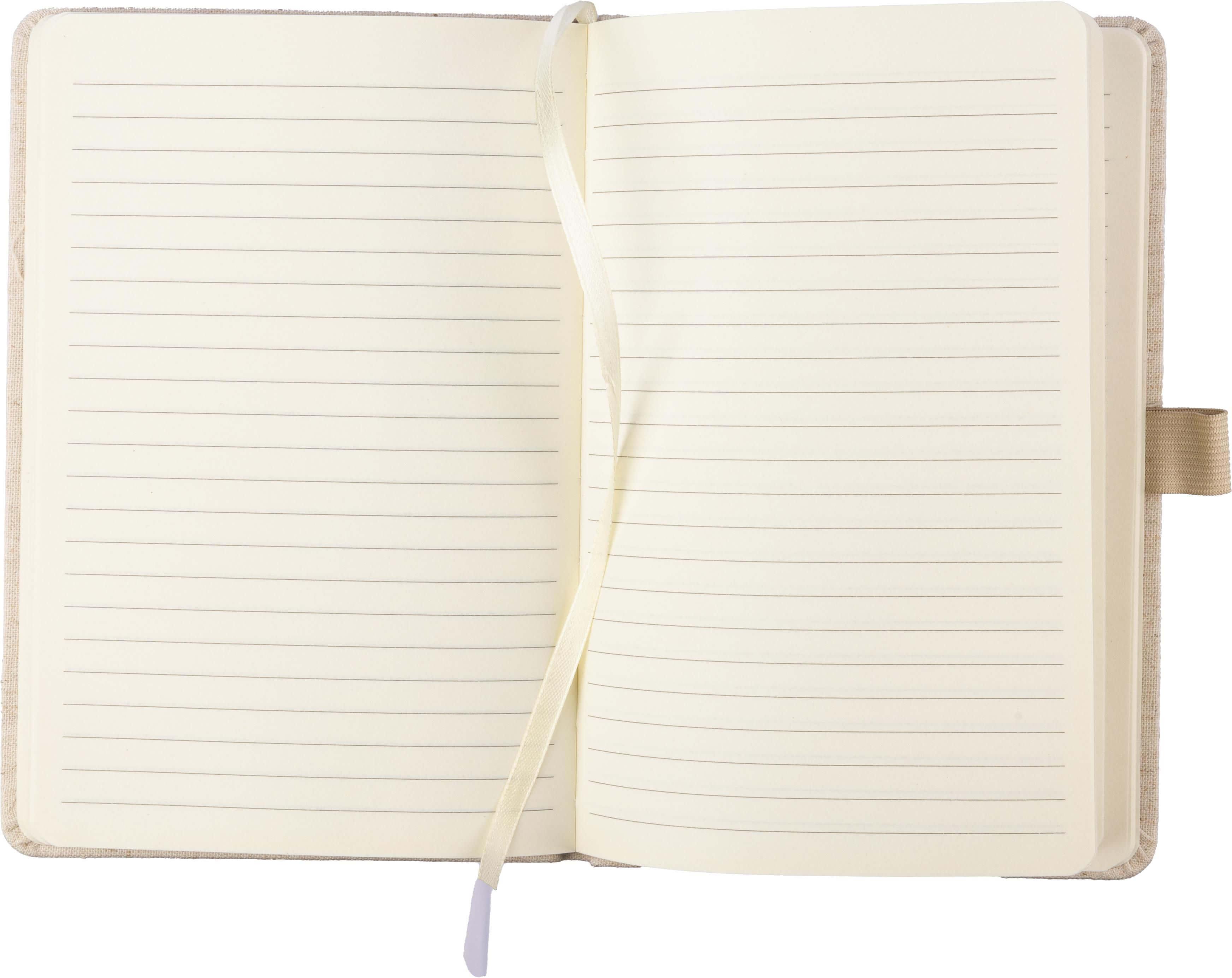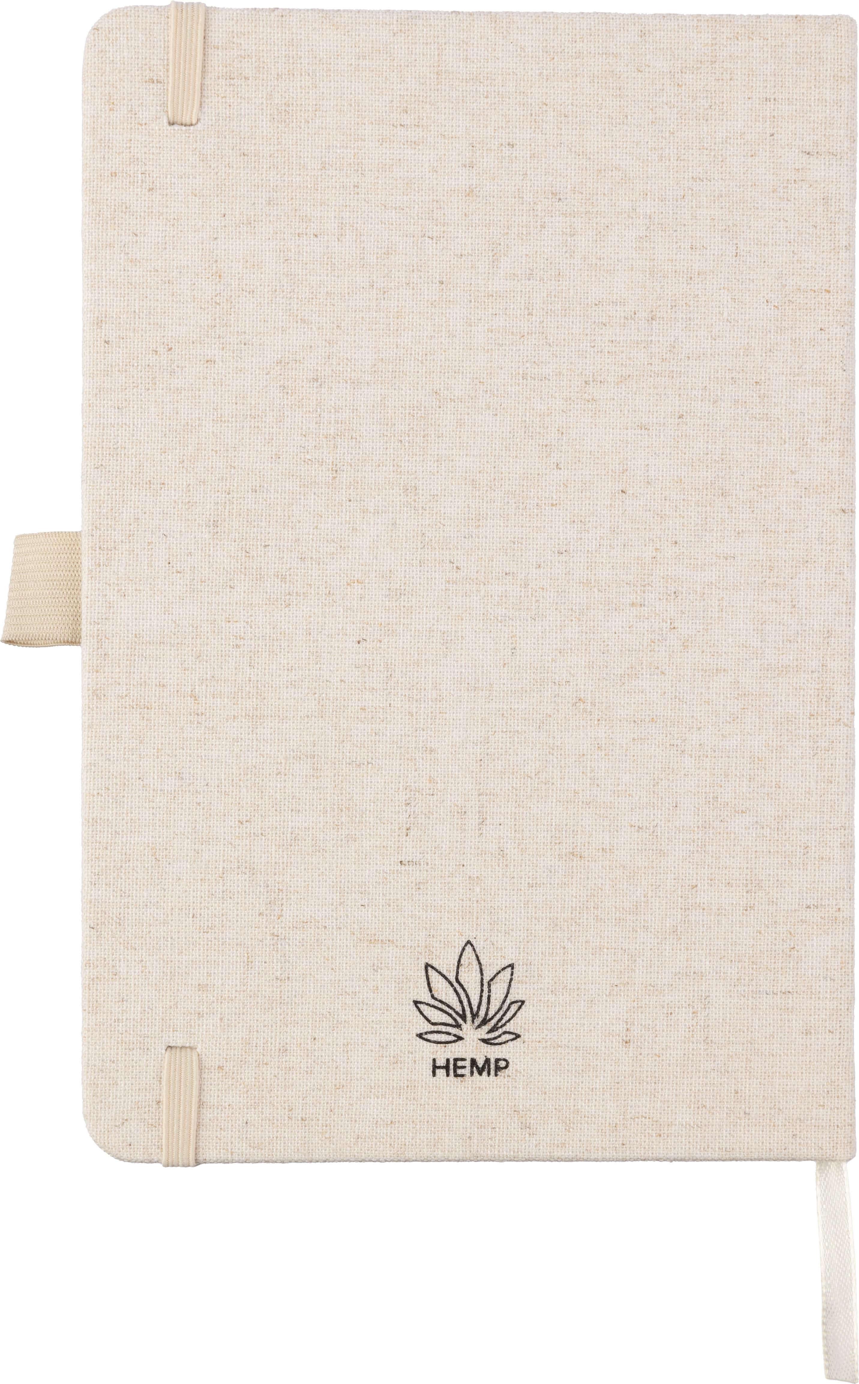 Caderno de cânhamo (aprox. A5) com 80 páginas, com suporte para esferográfica, elástico e fita em uma cor natural à copndizer. Inclui um logotipo de cânhamo na parte de trás da capa.