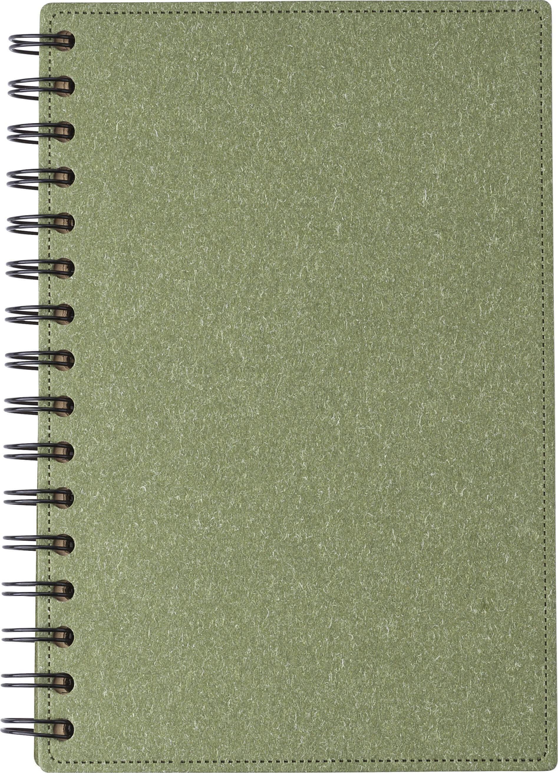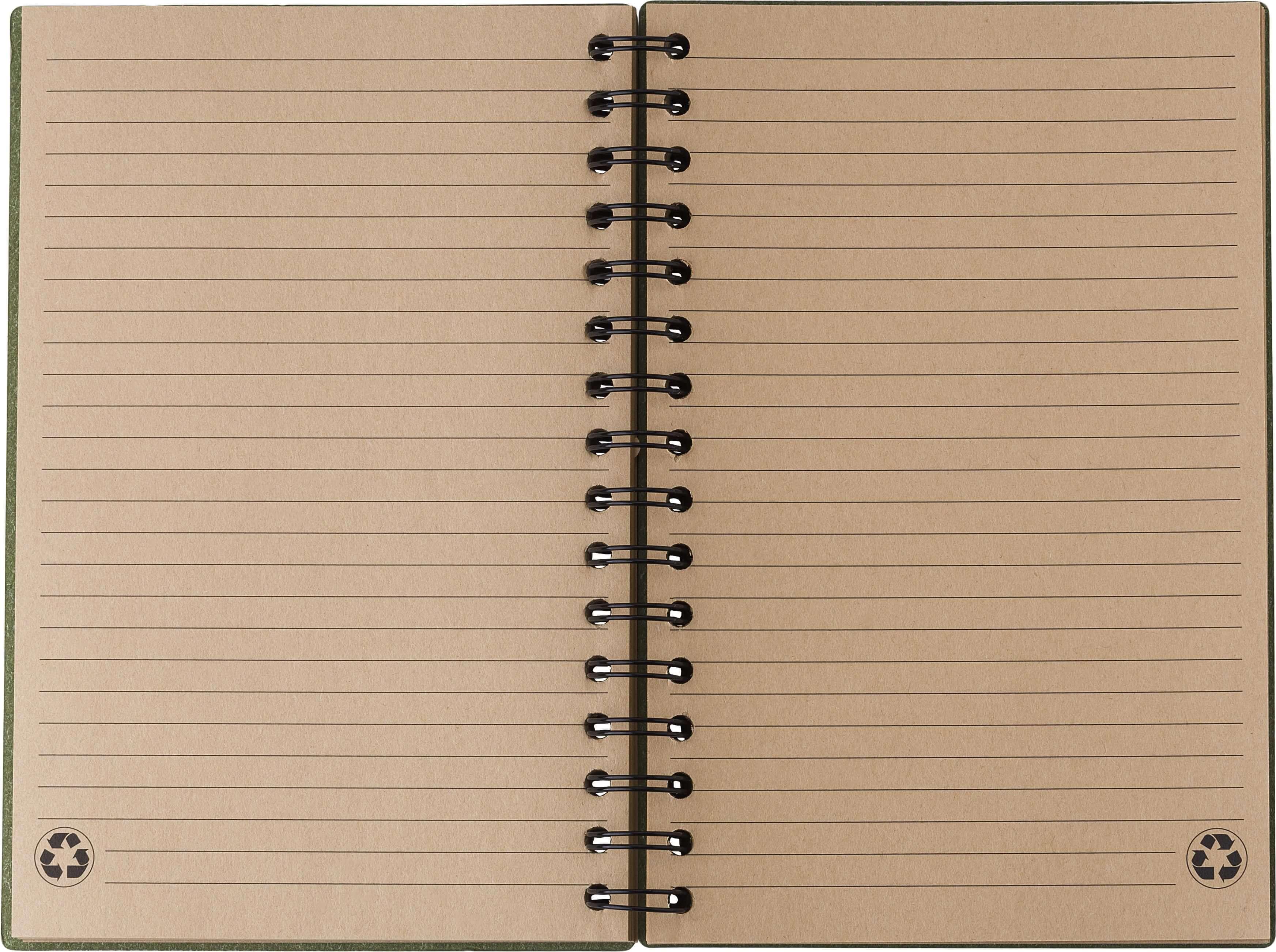 Caderno de capa dura A5 em cartão reciclado com 160 páginas pautadas em papel castanho reciclado. Logótipo ‘Recycled’ em cada página.