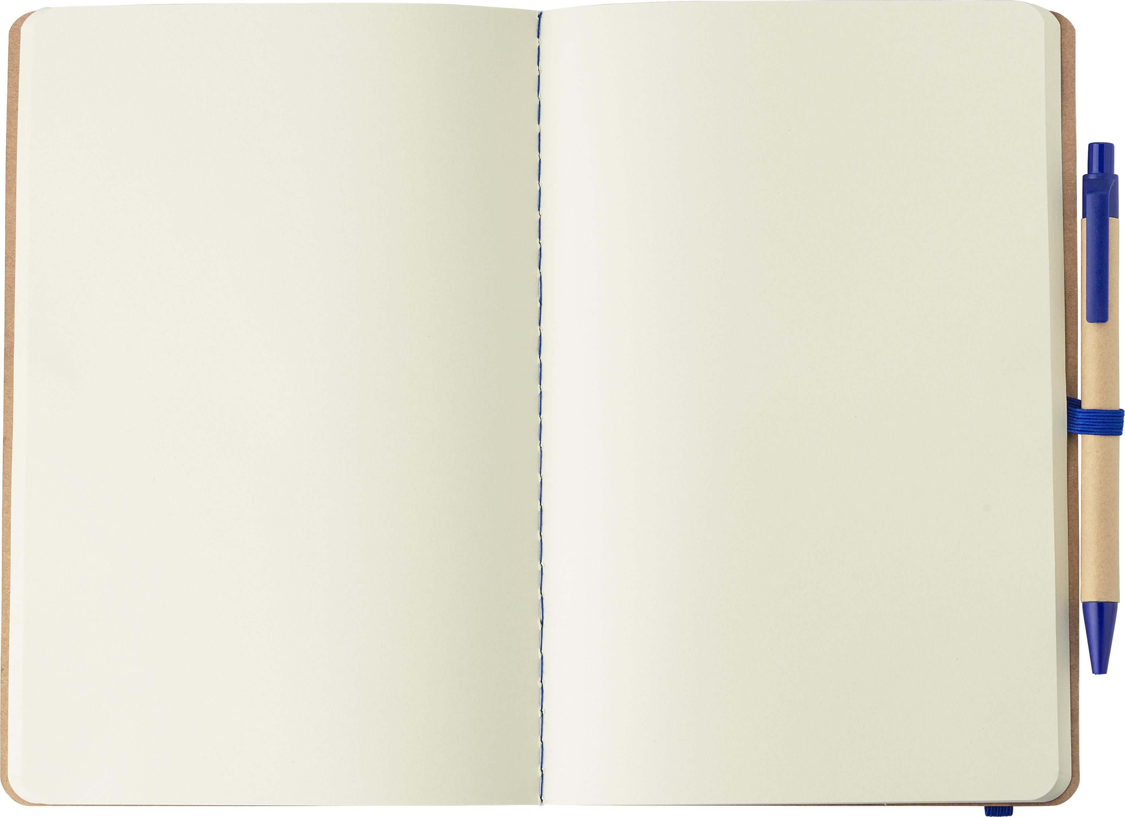 Caderno em cartão reciclado (aprox. A5) com 120 folhas em branco. O papel neste caderno é certificado FSC® Mix. Inclui uma esferográfica de cartão e palha de trigo com tinta azul. Apresentado num saco de polietileno.