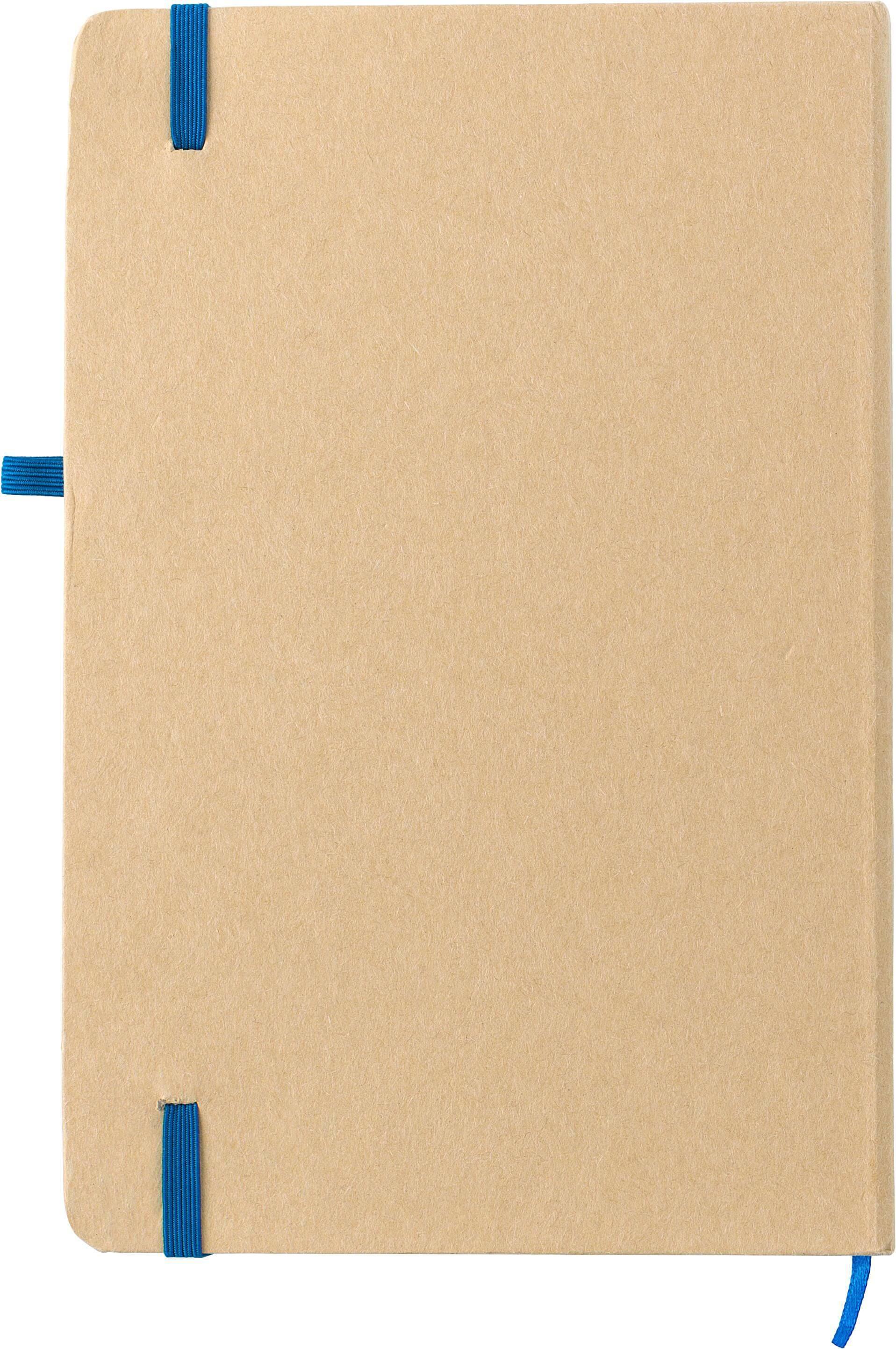 Caderno de papel celular (aprox. A5), com 80 páginas pautadas. Elástico e borracha a condizer para uma esferográfica.
