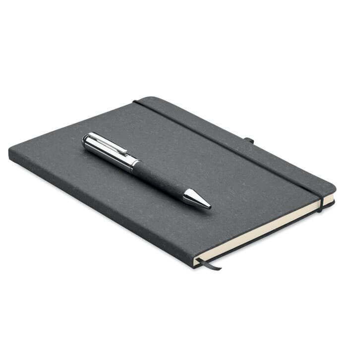 Conjunto de oferta. Caderno A5 em pele reciclada (75%) com capa dura. 160 páginas pautadas (80 folhas). Elástico, fita para marcadores de livros e porta-canetas a condizer. Caneta de metal com mecanismo de torção a condizer. Tinta azul. Apresentado numa caixa de papel kraft. FSC®-certified | FSC MIX CREDIT, P7.1, FSC-C213206