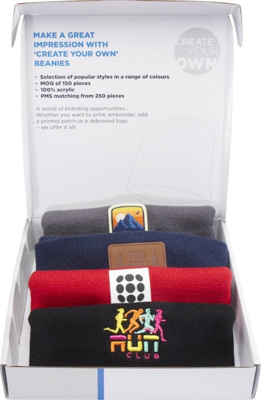 Caixa de amostra de gorros com 3 gorros em estilos diferentes: 1 de camada dupla com dobra, 1 de camada dupla com acabamento e 1 de camada dupla com 6 costuras.