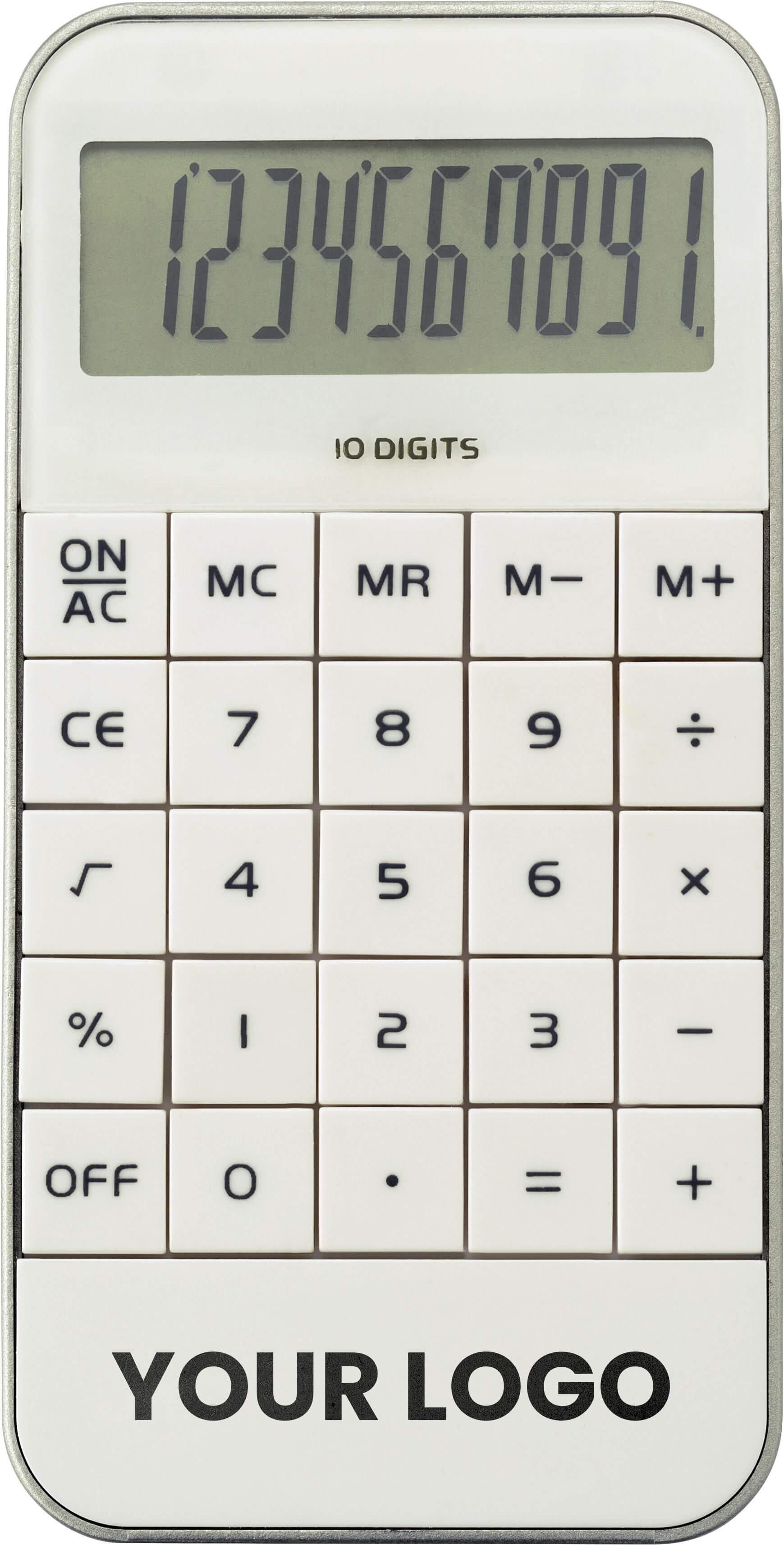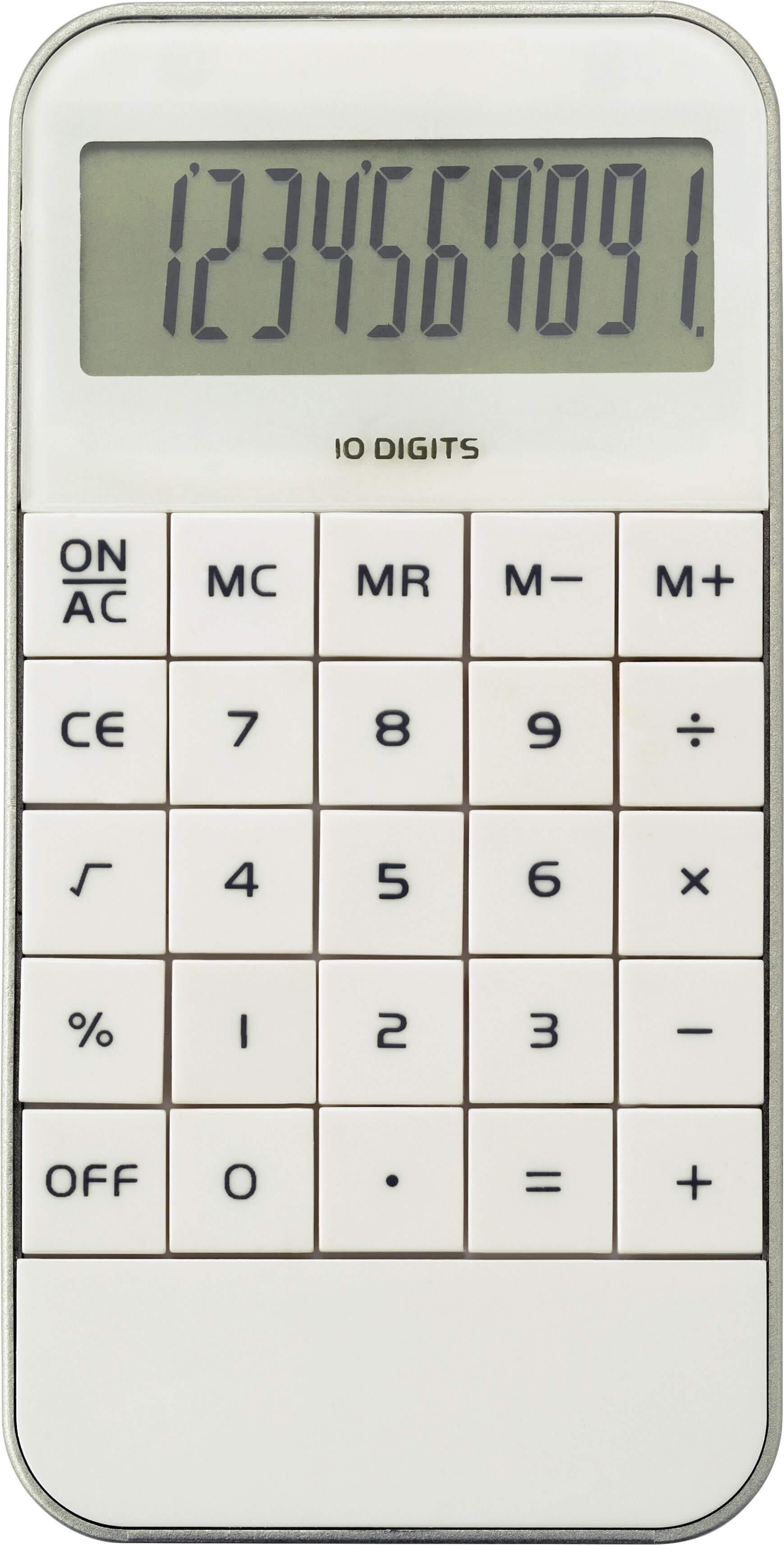 Calculadora em forma de telemóvel com detalhes de cores no perfil. Entre as suas funções, incluindo a memória, cálculo de porcentagem e raiz quadrada.
