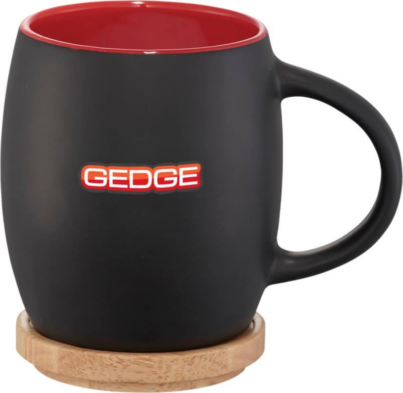 A atraente caneca de cerâmica Heart 400 ml com acabamento mate e base de madeira é um companheiro para uma bebida quente em dias frios de Inverno. O desenho redondo destaca-se em todo o lado, tal como o acento de cor no interior. O material cerâmico é resistente ao calor e a base de copos também pode ser utilizada como tampa. A caneca Hearth (incluindo impressão) é lavável na máquina de lavar louça, de acordo com a norma EN12875-1, durante pelo menos 125 lavagens.
