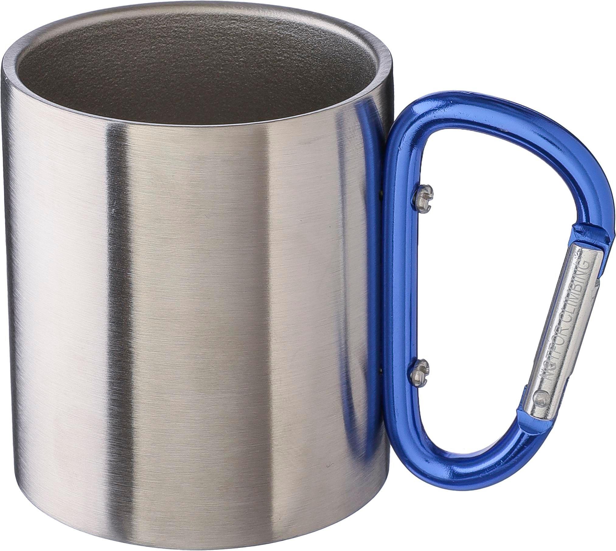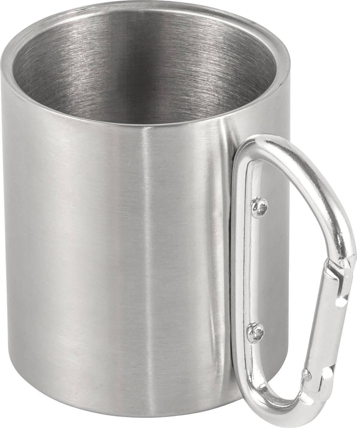 Caneca de viagem de parede dupla, em aço inoxidável (185 ml). A pega pode também ser usada como mosquetão.