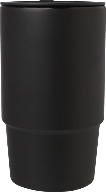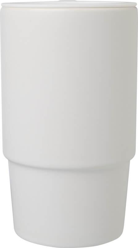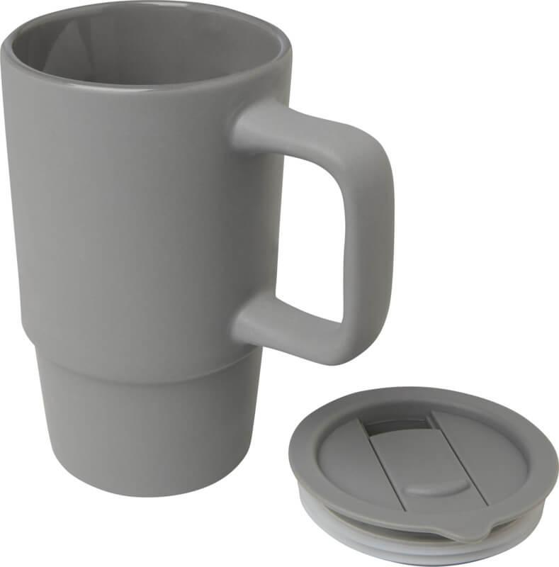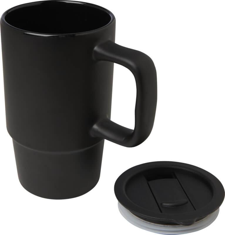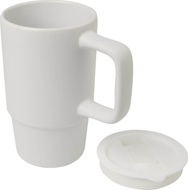 Caneca de cerâmica com pega grande para um transporte fácil e uma tampa de plástico à prova de derramamento para uma maior conveniência onde quer que esteja. O exterior apresenta um acabamento fosco elegante e a garrafa pode ser lavada na máquina de lavar louça para todos os métodos de impressão. Apresentada numa caixa de presente de cartão reciclado. Capacidade volumétrica: 450 ml.