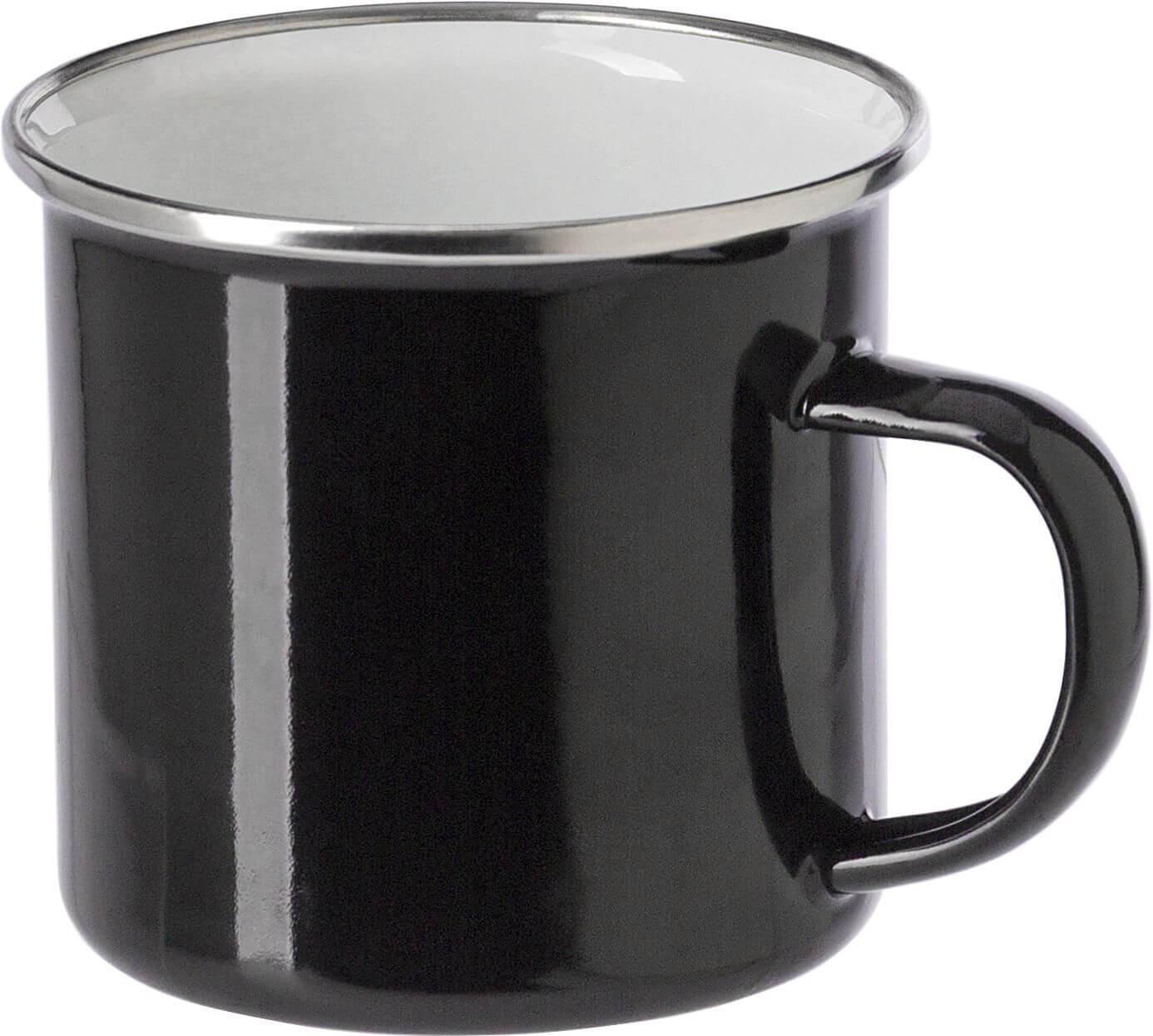 Caneca esmaltada (350 ml) com aro de aço inoxidável. Apresentado individualmente numa caixa de cartão castanho. Este produto não pode ser lavado na máquina de lavar louça.