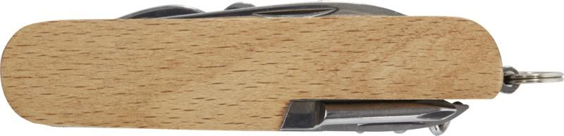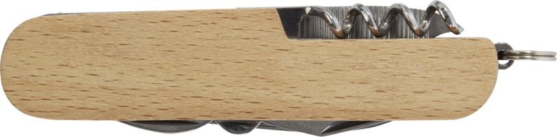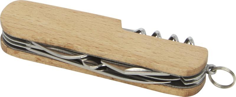 Canivete compacto, resistente e durável, feito em aço inoxidável de alta qualidade com cabo em madeira de faia. Este é um canivete obrigatório para qualquer escuteiro, habilidoso e entusiasta do ar livre. Inclui 7 funções: faca, saca-rolhas, lima/limpador de lima, anel de porta-chaves, chave de fendas plana, abre garrafas/latas e tesoura. A madeira de faia utilizada é proveniente de fontes sustentáveis, ambiental e socialmente responsáveis. O tamanho quando aberta é 17 x 2,5 cm e quando fechada é 9,5 x 2,5 cm. Vem com um manual de instruções e está embalada numa caixa de presente em cartão reciclado com um tamanho de 12 x 4,5 x 2 cm. A gravação a laser é recomendada como uma opção de decoração sustentável.