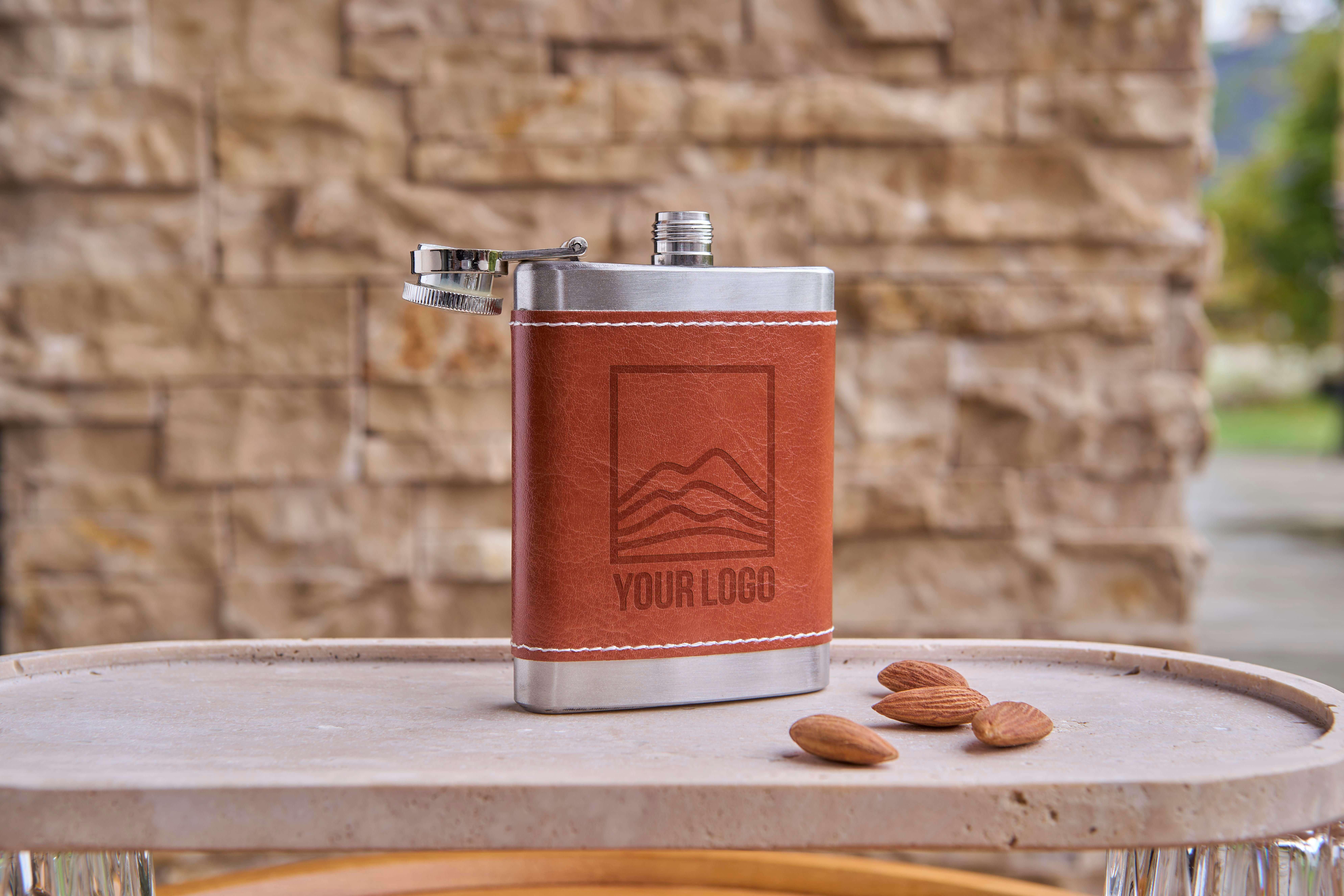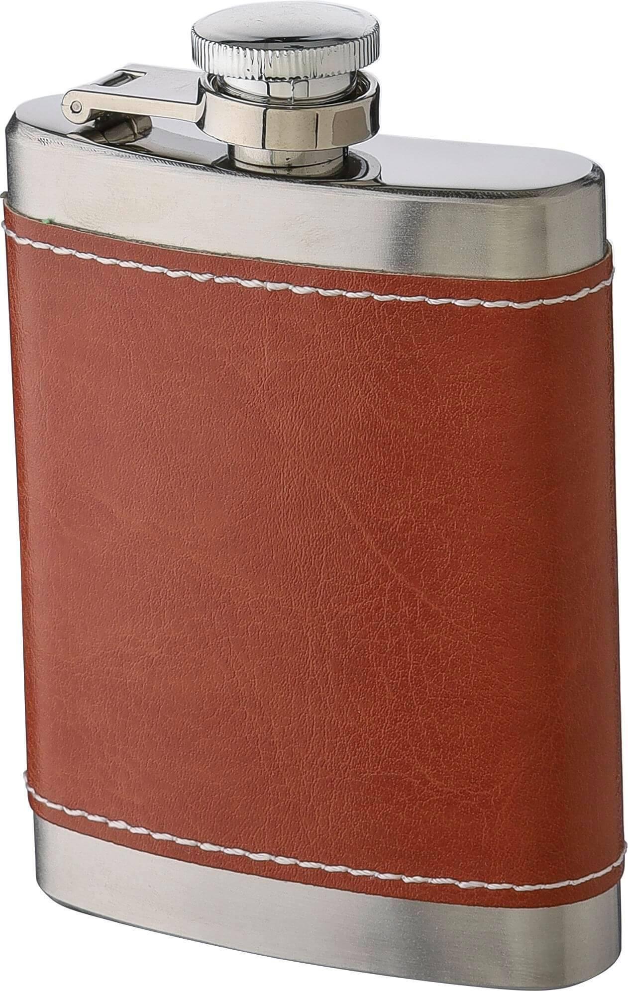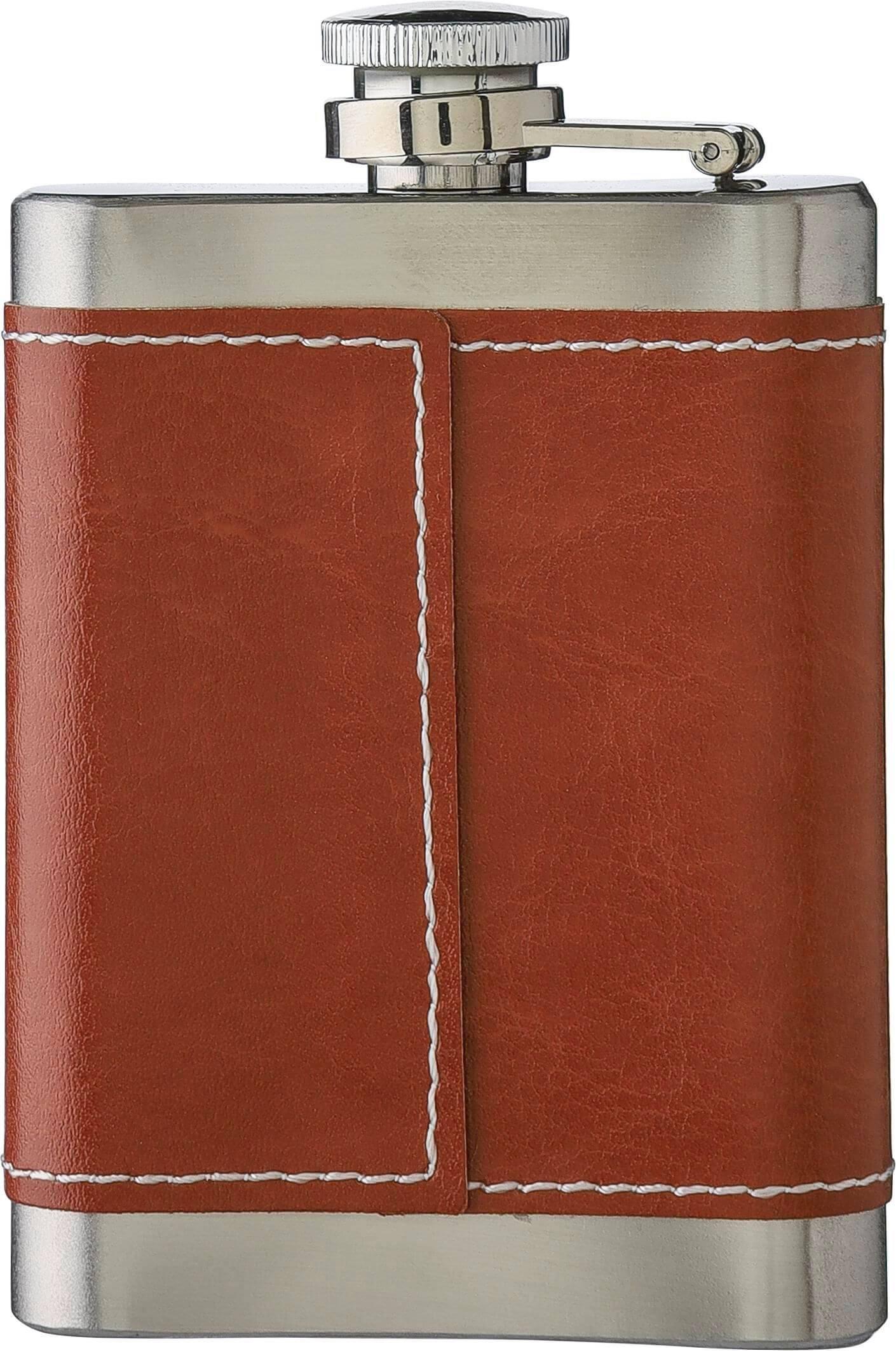Cantil de bolso em aço inoxidável (100 ml) com uma manga de PU. Fabricado em aço inoxidável 304. Apresentado individualmente numa caixa de cartão castanha.