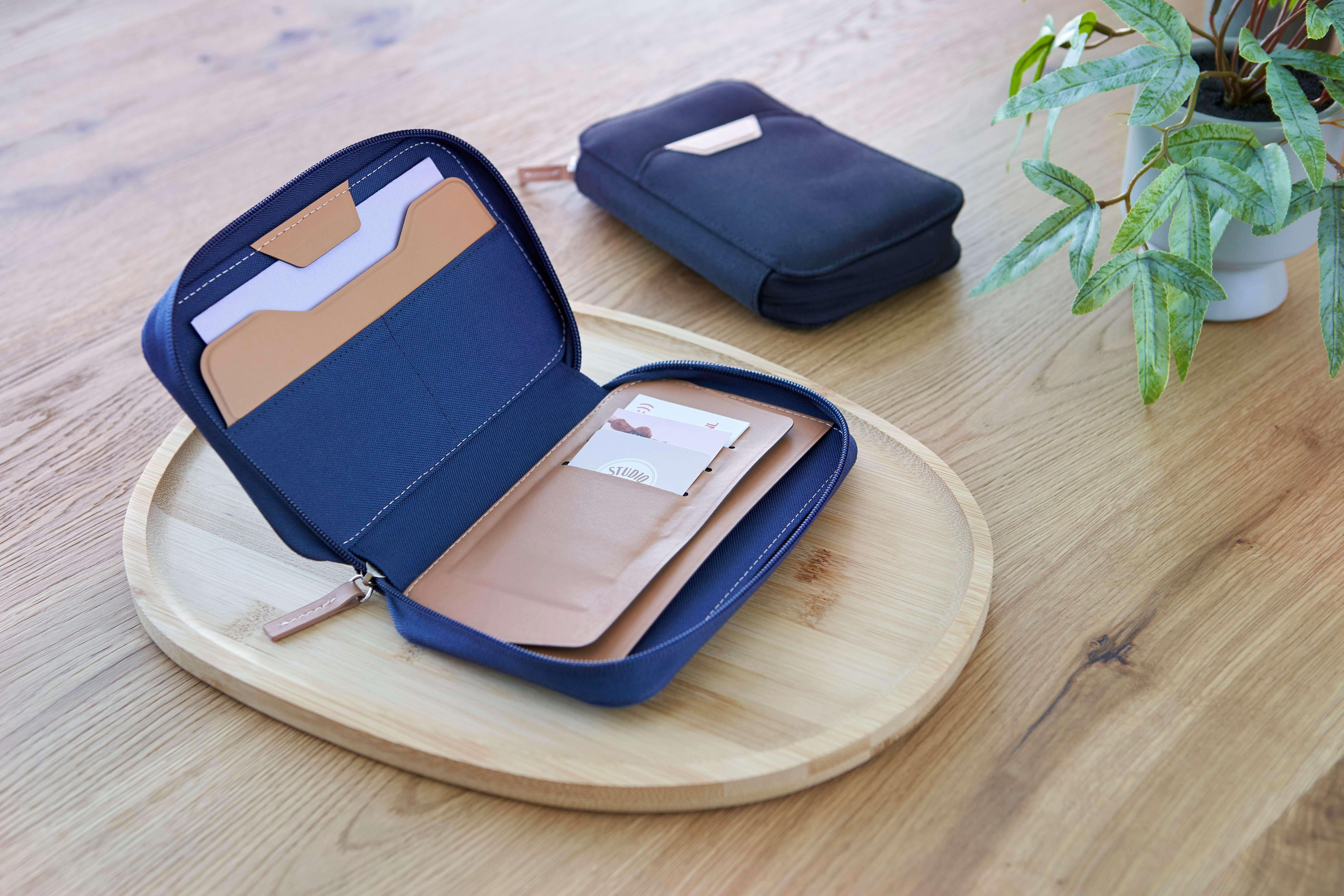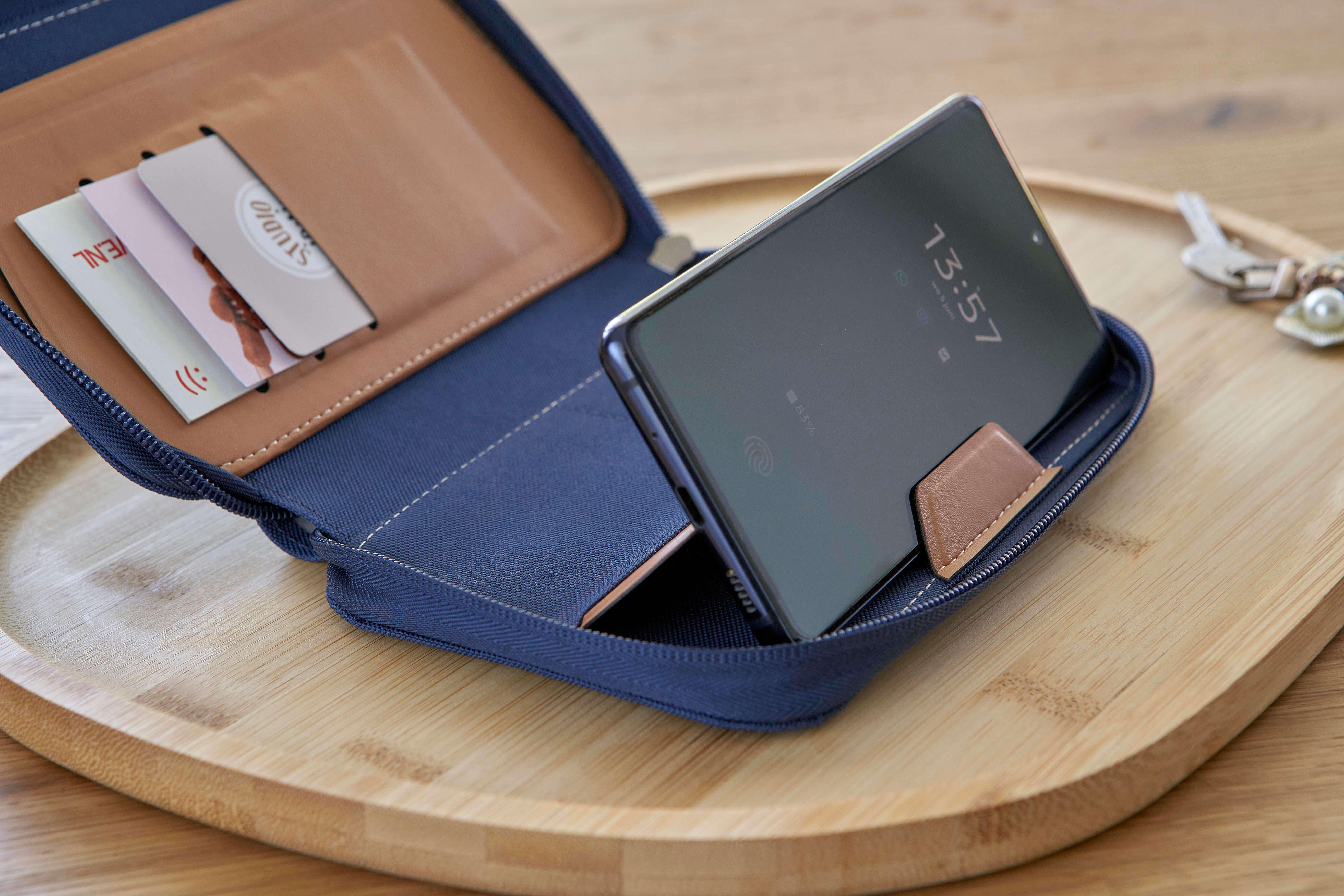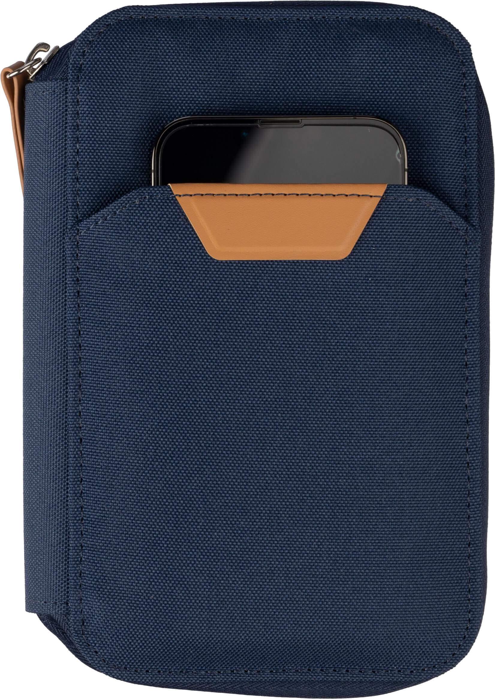 Carteira de viagem rPET com detalhes de PU e fecho de correr. Proteção RFID dentro. Inclui suporte para telemóvel e vários compartimentos, incluindo um pequeno bolso frontal. Embalado individualmente em uma caixa de papelão marrom.
