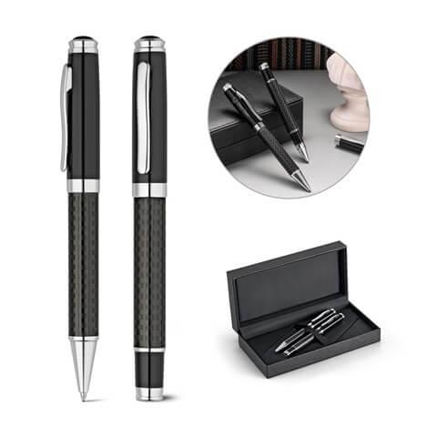 Conjunto de roller e esferográfica em metal e fibra de carbono, ambos com clipe. Esferográfica com mecanismo twist. Escrita a p