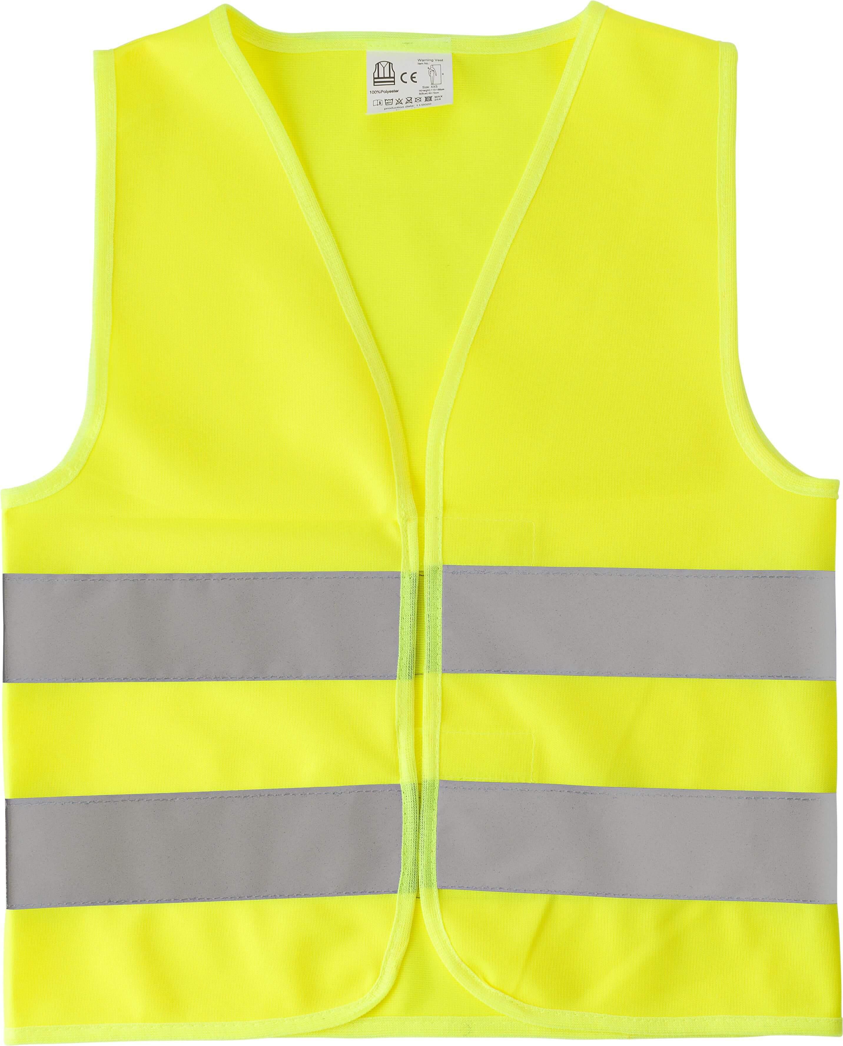 Colete de poliéster de alta visibilidade, para crianças. O preço corresponde ao tamanho S. Consultar preço (mais económico) para os restantes tamanhos. XXS= 47×37 cm, XS= 50×46,5 cm, S= 57,5×54 cm (LxW).