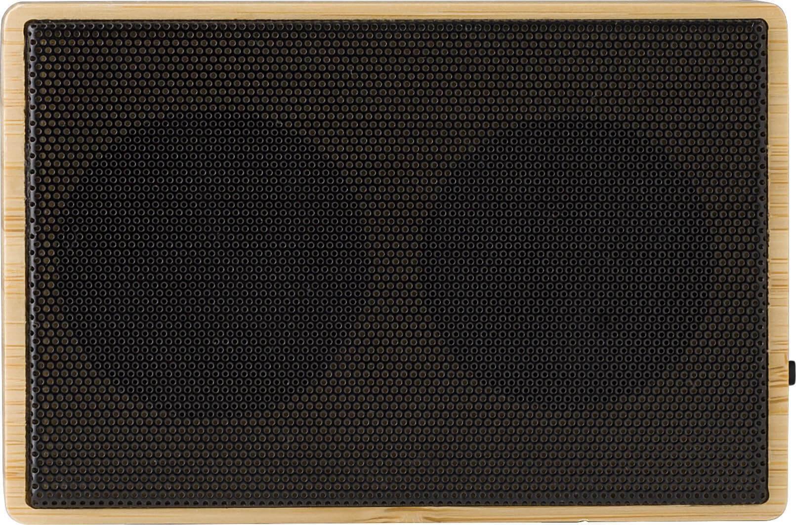 Coluna sem fios em bambu com carregamento solar. Inclui cabo de carregamento USB-C de 3 W. Duração da bateria até 4 horas (500 mAh).