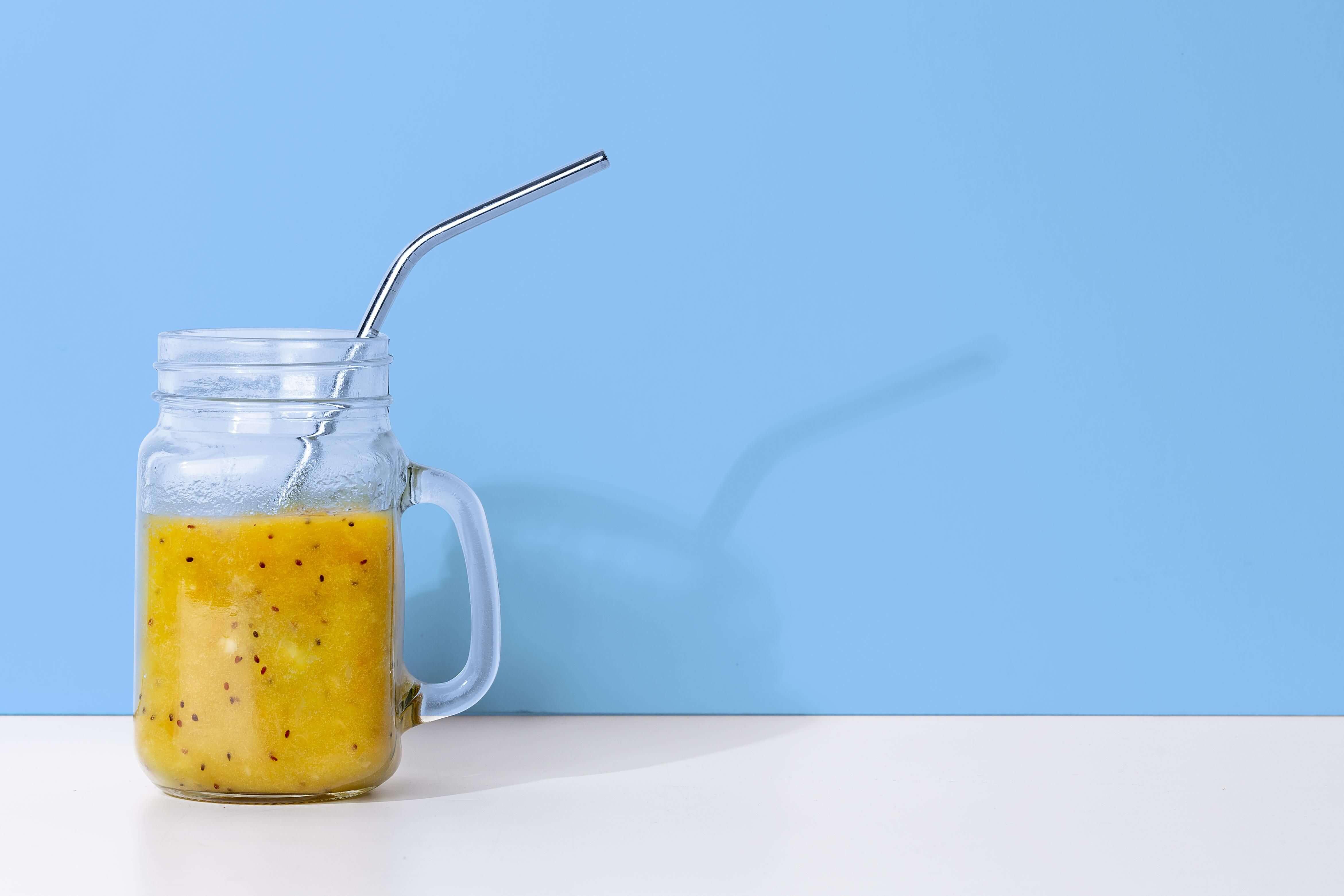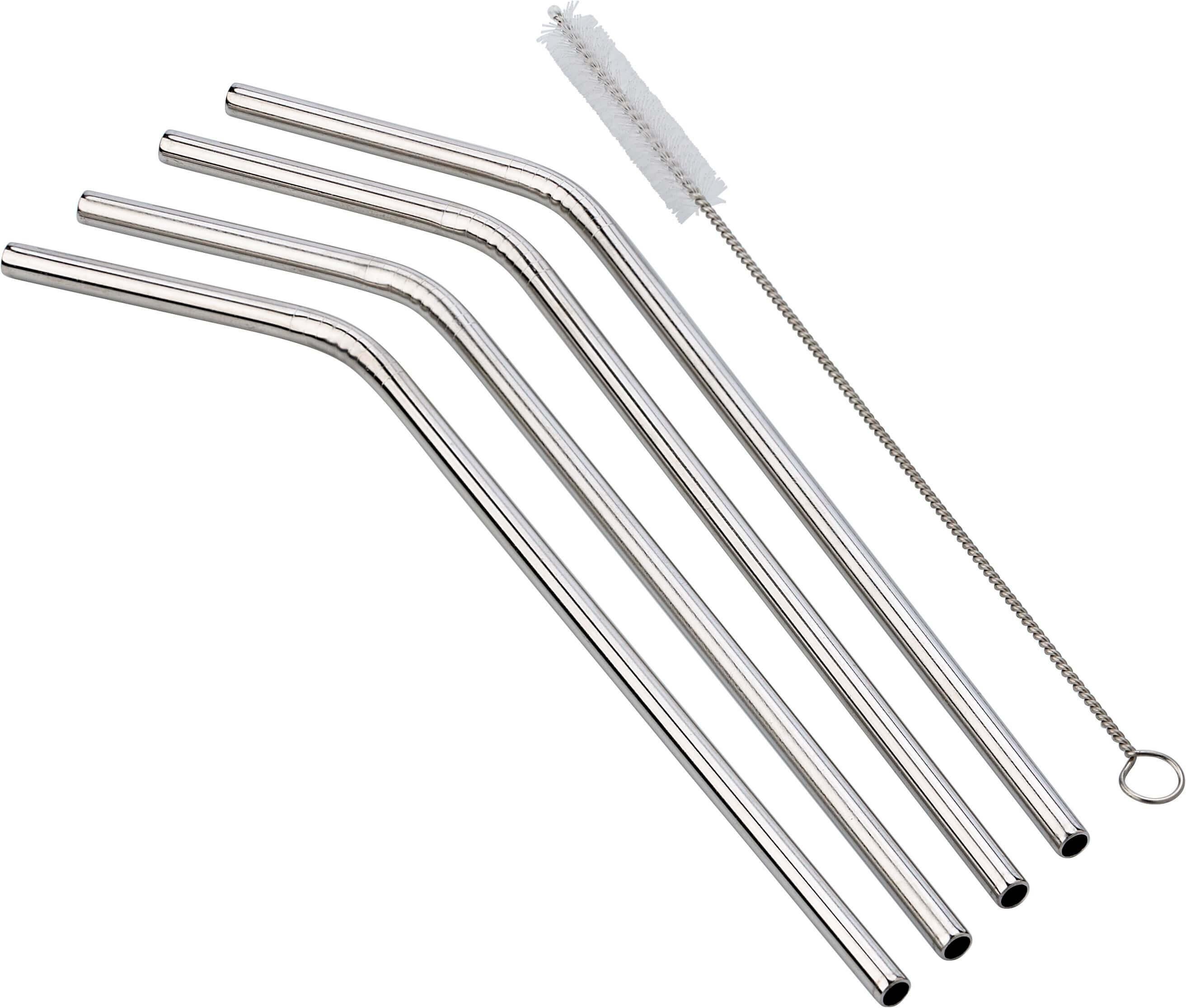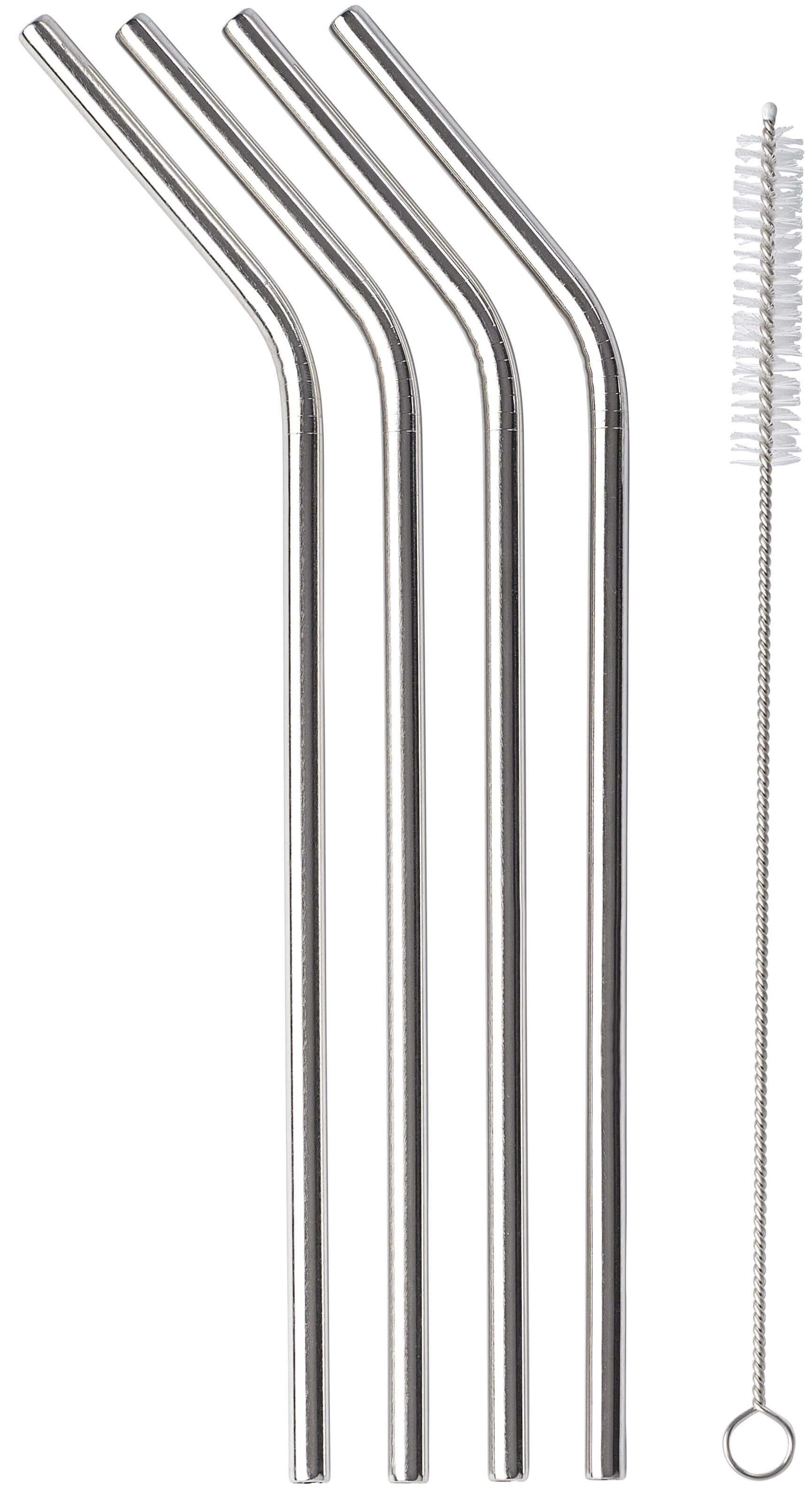 Quatro palhinhas reutilizáveis, feitas de aço inoxidável, respeitosas com o meio ambiente, com 23 cm de comprimento. O conjunto inclui uma escova de limpeza.